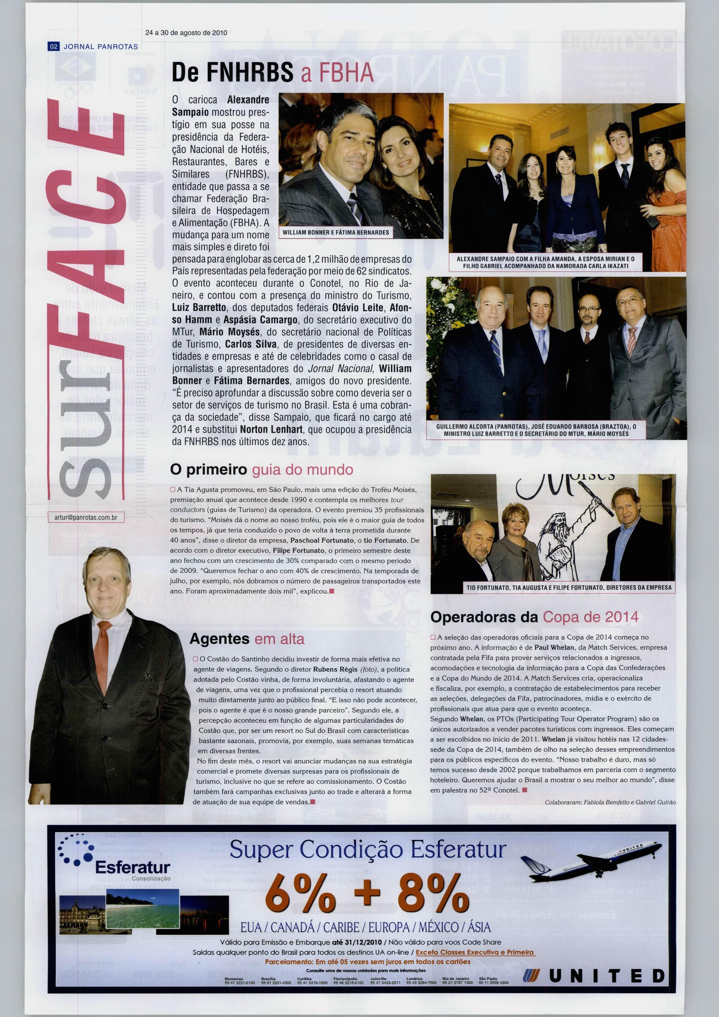 O carioca Alexandre Sampaiomostroupres tígioemsuapossena presidênciadaFedera ção Nacional de Hotéis, Restaurantes, Bares e Similares (FNHRBS), entidadeque passa ase chamar FederaçãoBra sileirade Hospedagem eAlimentação (FBHA). A mudançaparaumnome maissimplesediretofoi pensada paraenglobarascercade 1,2 milhãode empresas do Paísrepresentadaspelafederaçãopormeiode62sindicatos. Oevento aconteceu durante oConotel,noRiode Ja neiro, econtoucomapresençadoministrodo Turismo, Luiz Barretto,dosdeputadosfederais Otávio Leite, Afon soHammeAspásiaCamargo,dosecretário executivo do MTur, Mário Moysés, do secretário nacionaldePolíticas deTurismo,CarlosSilva,de presidentes dediversasen tidades e empresas eatéde celebridades como ocasalde jornalistase apresentadores do Jornal Nacional, William BonnereFátimaBernardes,amigosdonovopresidente. "É preciso aprofundar a discussão sobre como deveria sero setordeserviçosdeturismono Brasil. Estaéumacobran çada sociedade", disseSampaio,queficaránocargoaté 2014esubstitui Norton Lenhart,queocupouapresidência da FNHRBS nos últimos dez anos.