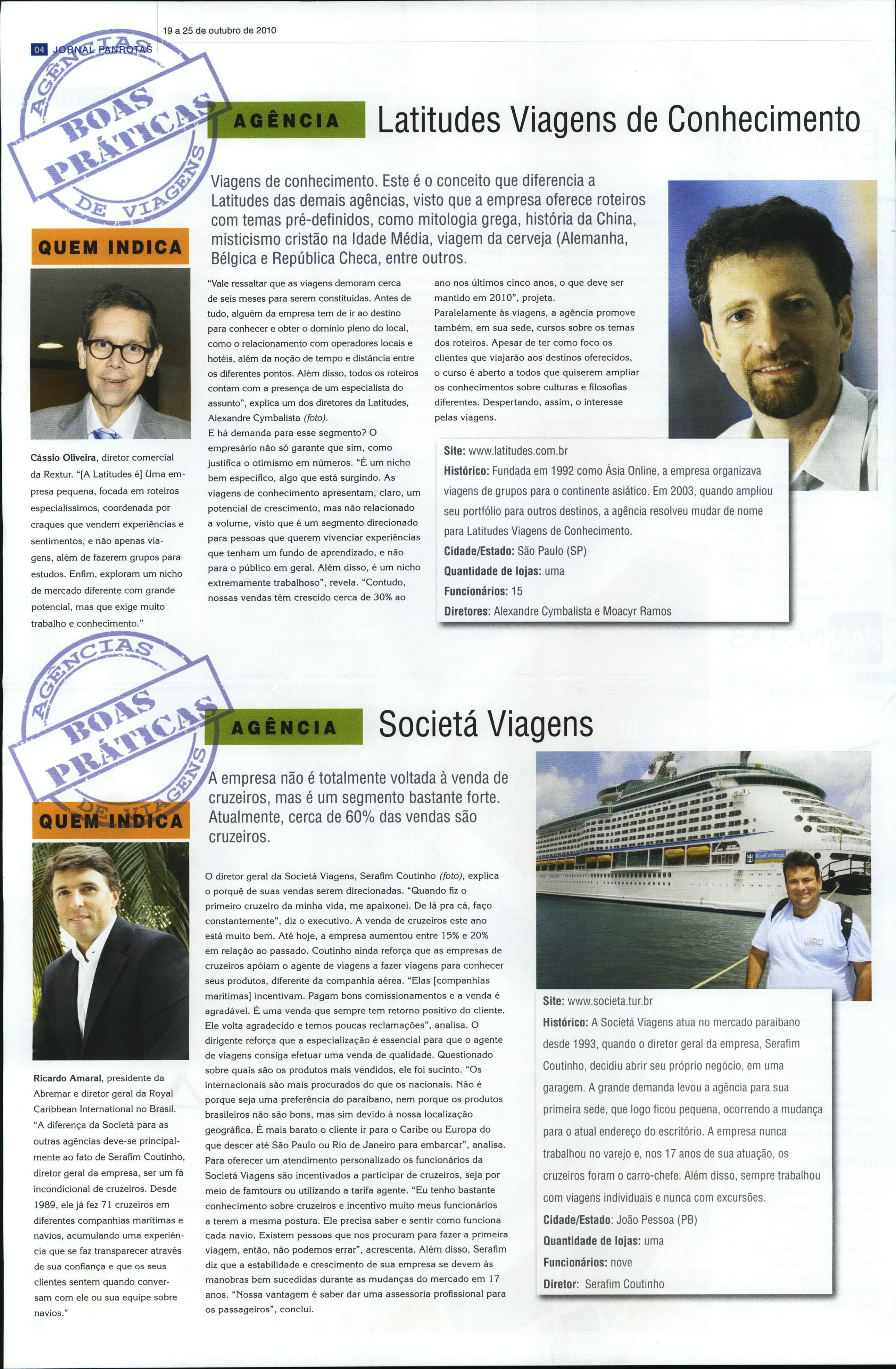 Ricardo Amaral, presidente da Abremar e diretor geral da Royal Caribbean International no Brasil. "A diferença da Societá para as outras agências deve-se principal mente ao fato de Serafim Coutinho, diretor geral da empresa, ser umfã incondicional de cruzeiros. Desde 1989, ele jáfez71 cruzeiros em diferentes companhias marítimas e navios, acumulando uma experiên cia que sefaz transparecer através de sua confiança e que os seus clientes sentem quando conver sam com ele ou sua equipe sobre navios."