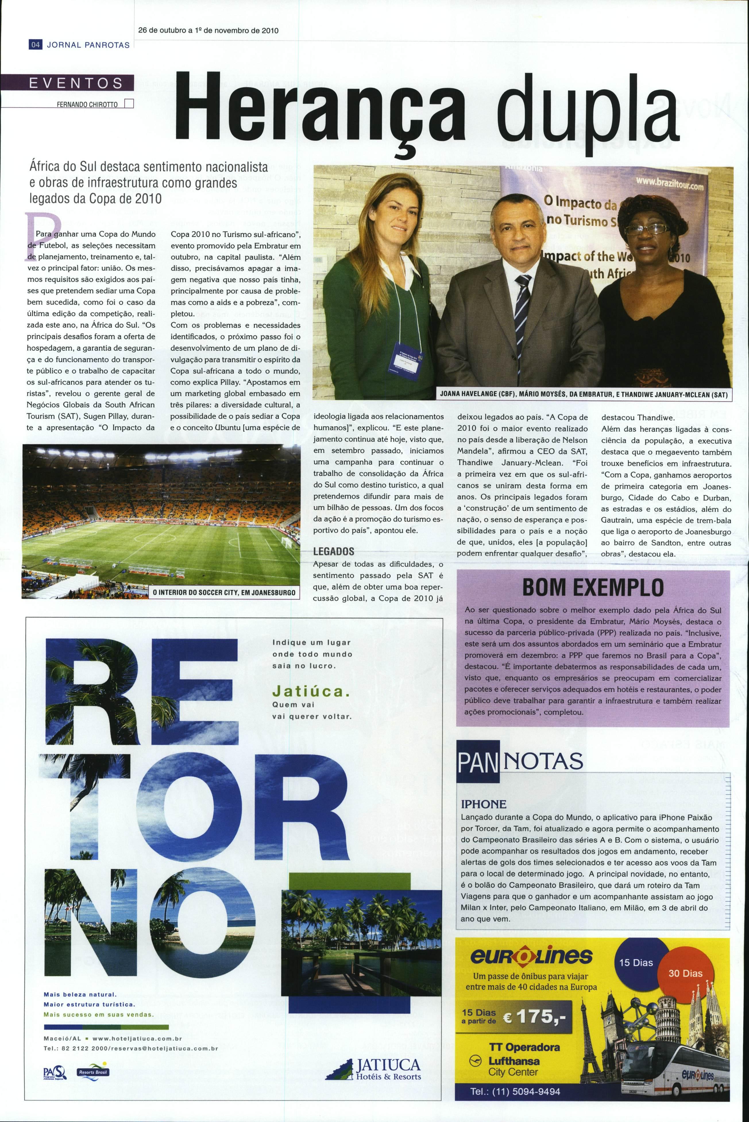 Copa 2010 no Turismo sul-africano", evento promovido pela Embratur em outubro, na capital paulista. "Além disso, precisávamos apagar a ima gem negativa que nosso país tinha, principalmente por causa de proble mas como a aids ea pobreza", com pletou.