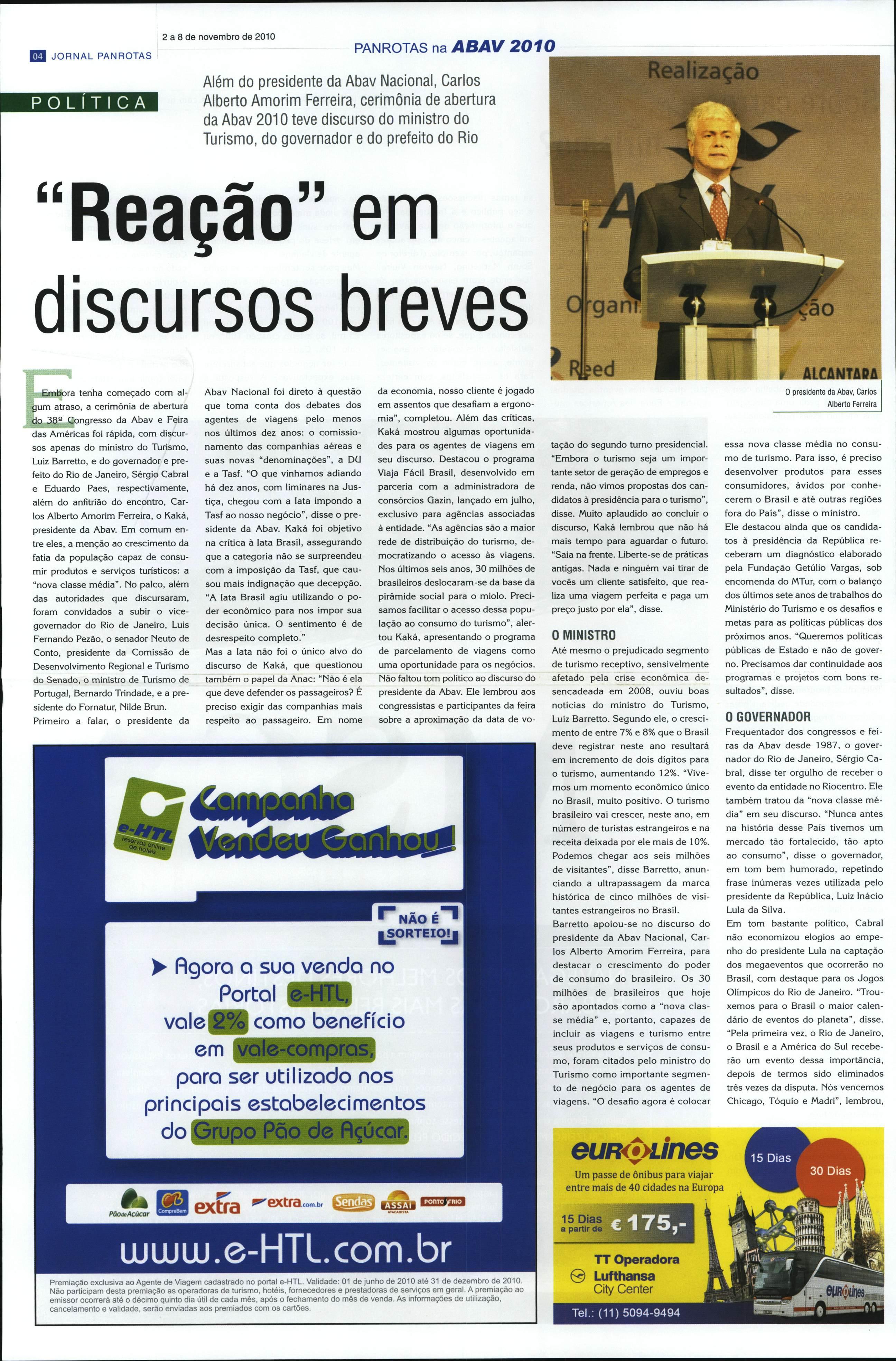 tenha começado com alatraso, a cerimônia de abertura ísso da Abav e Feira das Américas foi rápida, com discur sos apenas do ministro do Turismo, Luiz Barretto, edo governador e pre feitodoRio de Janeiro, Sérgio Cabral e Eduardo Paes, respectivamente, além do anfitrião do encontro, Car los Alberto Amorim Ferreira, o Kaká, presidente daAbav. Em comum en tre eles, a menção ao crescimento da fatiada população capaz de consu mir produtos e serviços turísticos: a "nova classe média". No palco, além das autoridades que discursaram, foram convidados a subir o vicegovernador doRiode Janeiro, Luis Fernando Pezào, o senador Neuto de Conto, presidente da Comissão de Desenvolvimento Regional e Turismo do Senado, o mir\istro de Turismo de Portugal, Bernardo Trindade, eapre sidente do Fornatur, Nilde Brun. Primeiro afalar,o presidente da