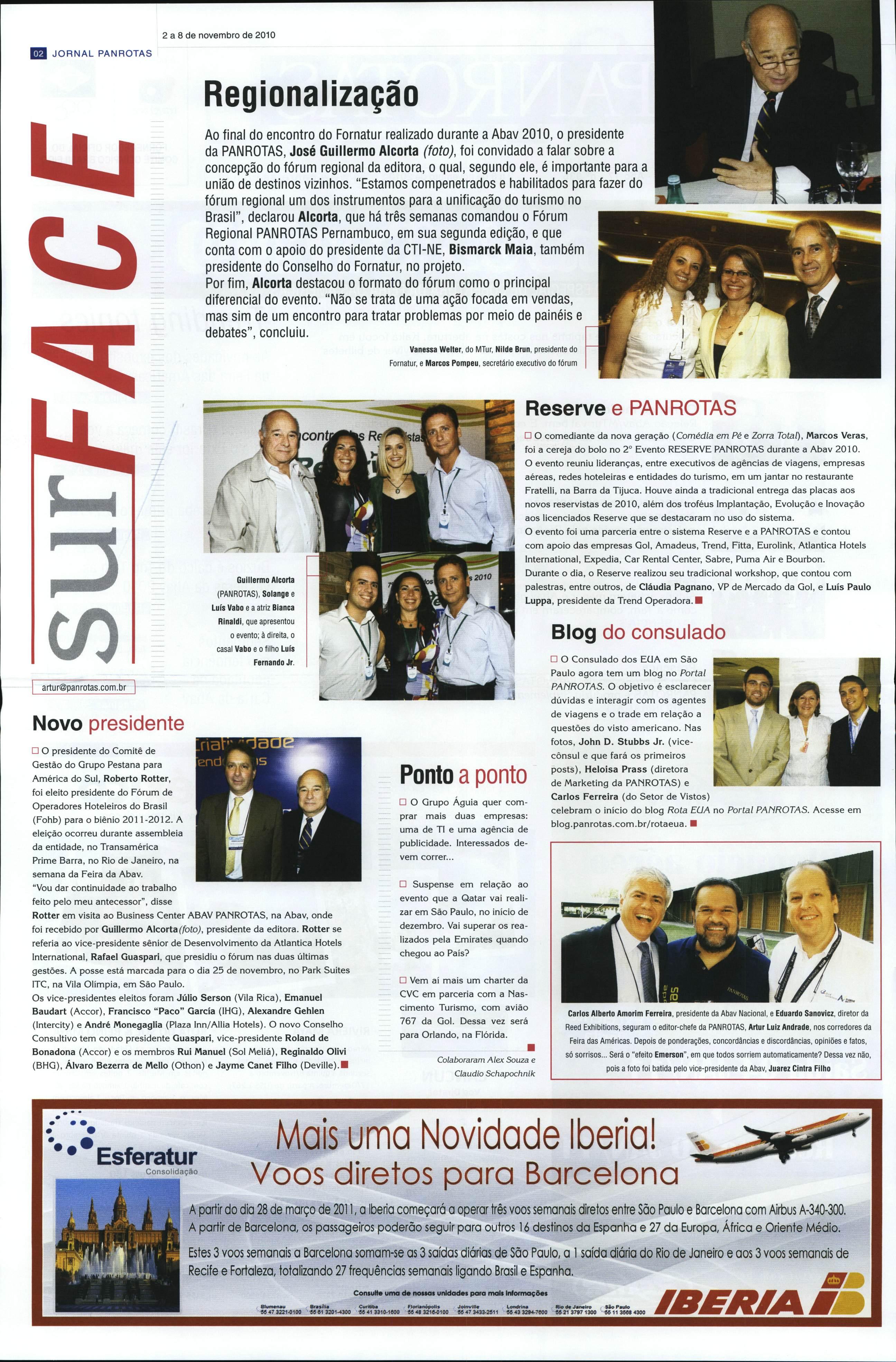 Aofinaldo encontro doFornaturrealizado durante aAbav 2010, o presidente da PANROTAS, José Guillermo Alcorta (foto), foi convidado a falar sobrea concepção do fórum regional da editora, o qual, segundo ele, é importante para a uniãodedestinosvizinhos."Estamos compenetrados ehabilitadosparafazerdo fórum regional umdosinstrumentosparaa unificação doturismono Brasil", declarou Alcorta, quehátrêssemanascomandouo Fórum Regional PANROTAS Pernambuco,emsuasegundaedição,eque contacomoapoiodo presidente da CTI-NE, Bismarck Maia, também presidentedo Conselho do Fornatur, no projeto. Porfim,Alcortadestacouoformatodofórumcomoo principal diferencial doevento."Nãosetratadeumaaçãofocadaemvendas, massimdeumencontroparatratar problemas por meio de painéis e debates", concluiu.