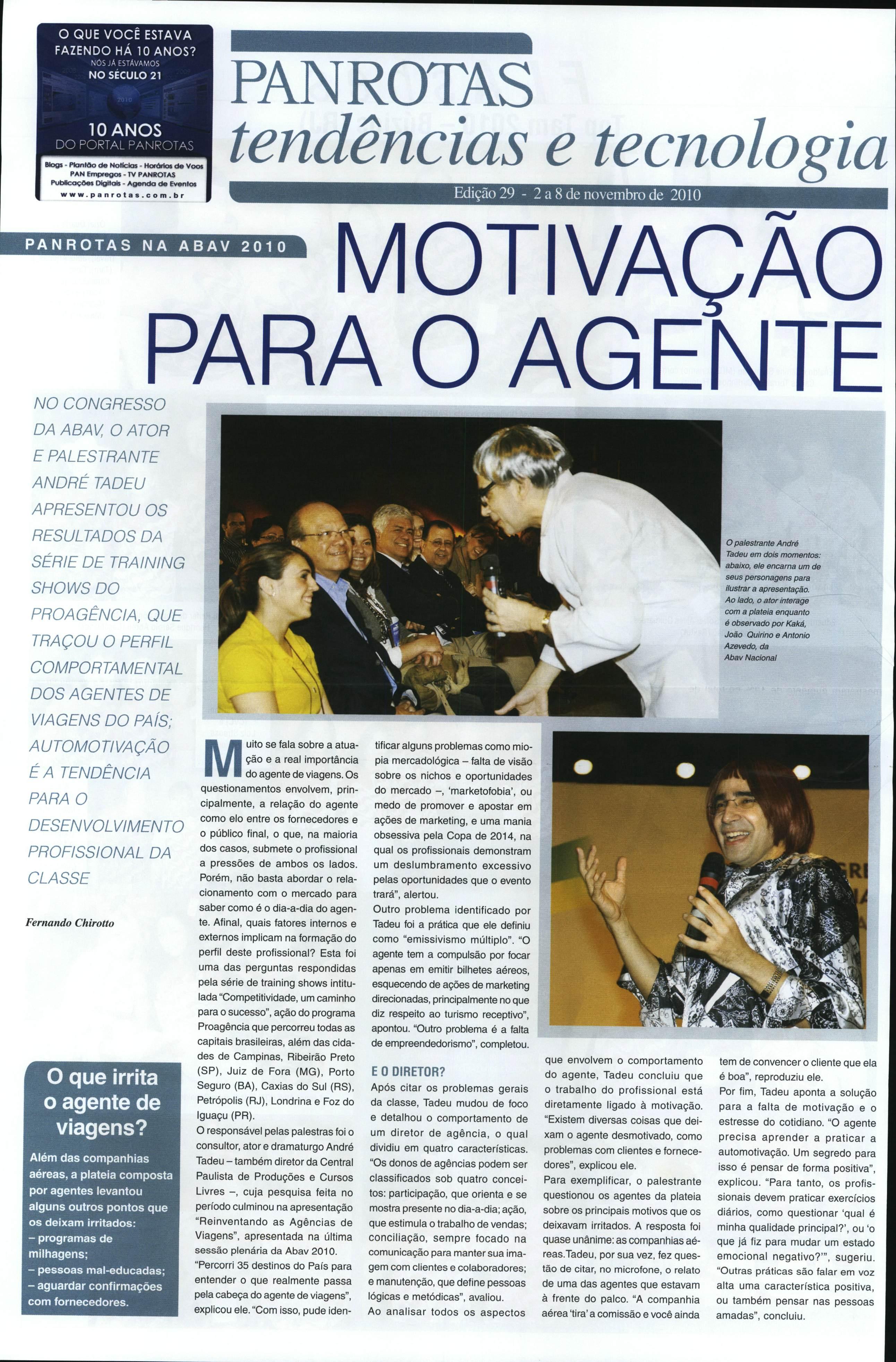 "Reinventando as Agências de Viagens", apresentada na última sessão plenária da Abav 2010. "Percorri35destinosdoPaíspara entender o que realmente passa pela cabeça do agente deviagens", explicouele."Comisso, pude iden