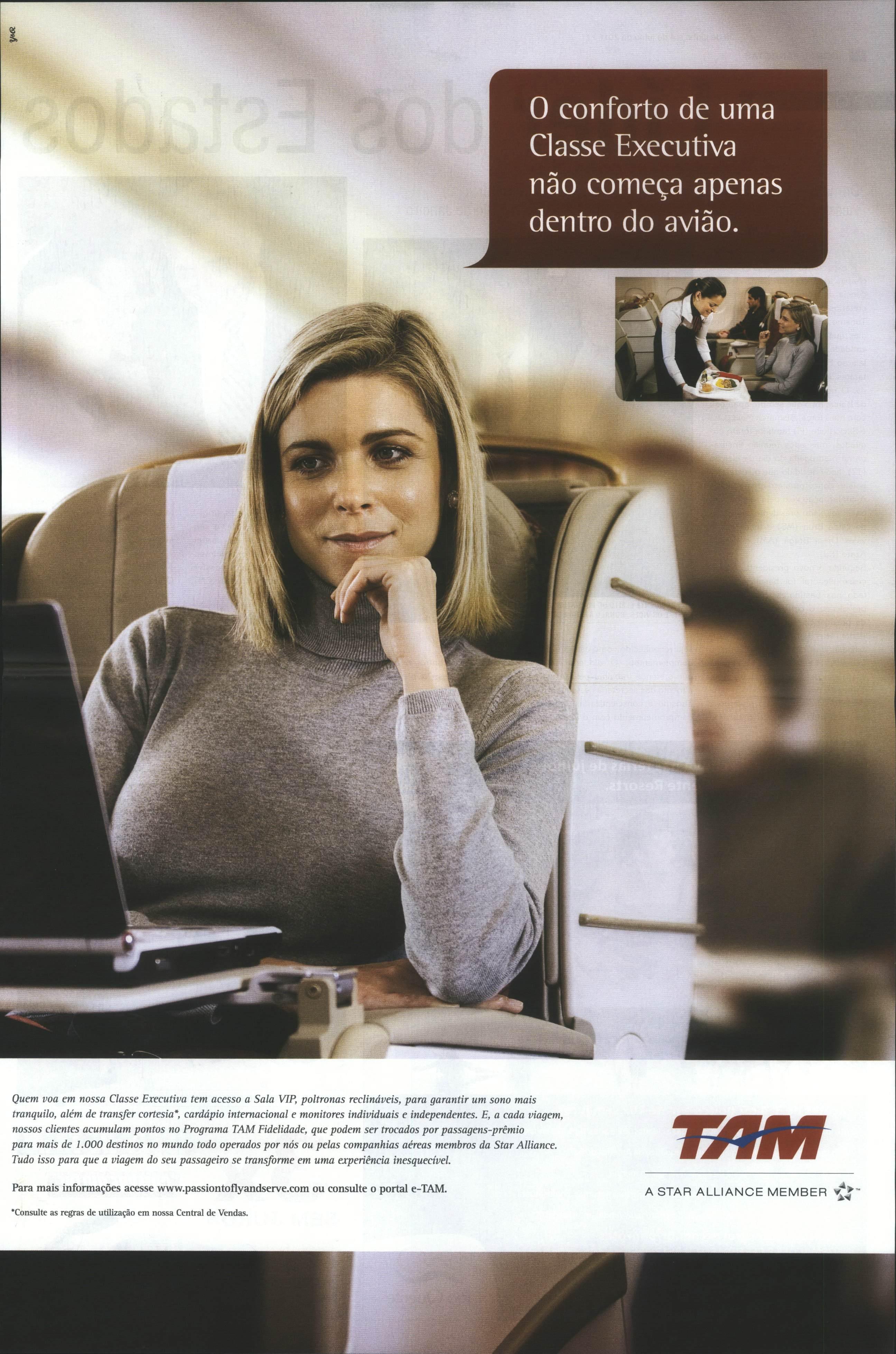 QuemvoaemnossaClasseExecutivatemacessoaSala VTP, poltronas reclináveis, para garantir umsonomais tranqüilo,alémde transfer cortesia*cardápiointernacionalemonitoresindividuaiseindependentes. E, acadaviagem, nossosclientesacumulampontosnoProgramaTAMFidelidade,quepodemsertrocadospor passagens-prêmio para maisde 1.000 destinosnomundotodooperados por nósou pelas companhias aéreas membrosda Star Alliance. Tudoisso para queaviagemdoseupassageirosetransformeemumaexperiência inesquecível.