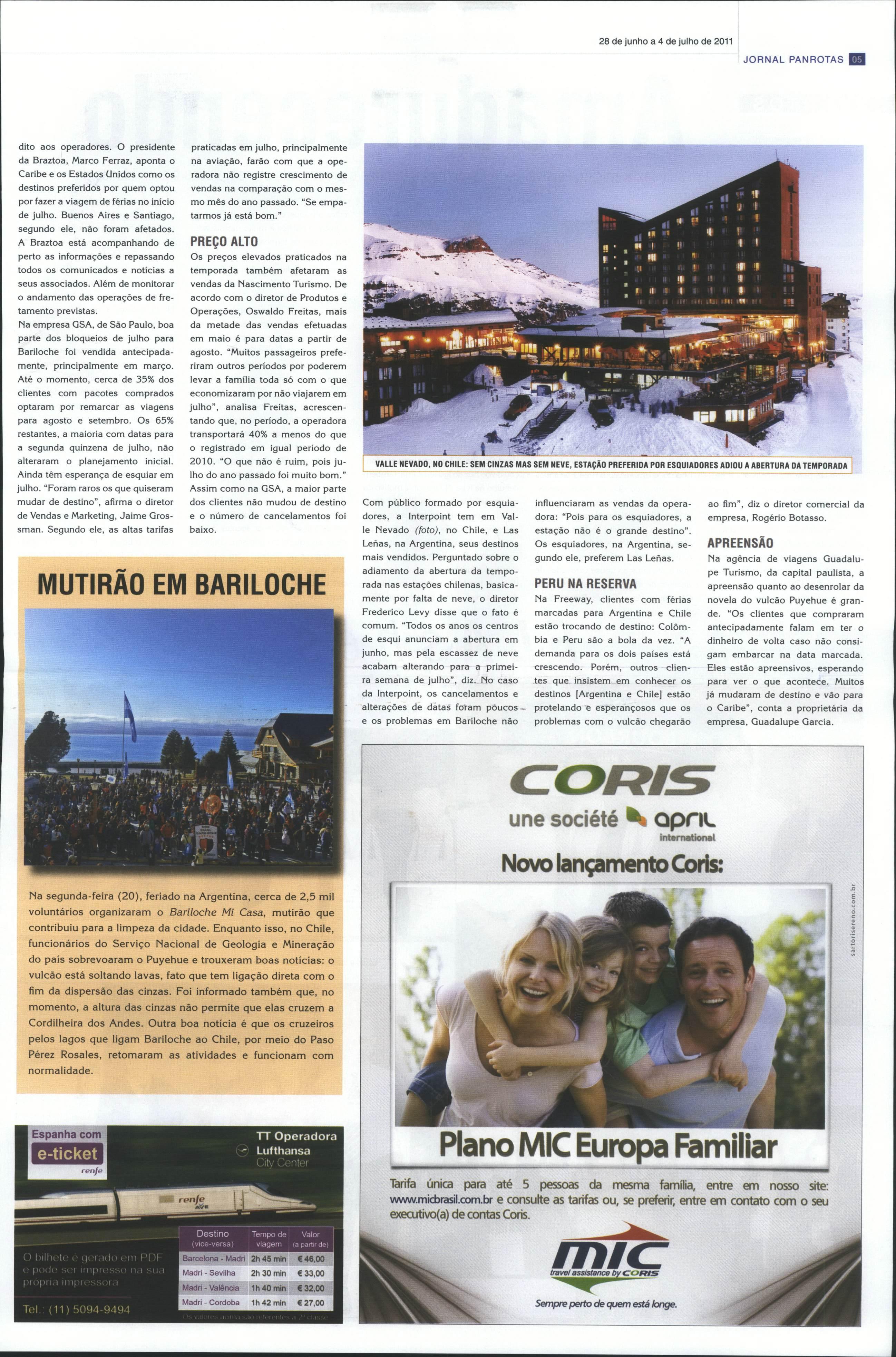 Mais uma semana chega ao fime as incertezas sobre a temporada de neve na América do Sul permane cem. Na edição 967 do Jornal PAN ROTAS, a reportagem conversou com Agaxtur, Tam Viagens, Fênix e CVC, empresas com voos fretados para Bariloche, que, ou cancelaram ou adiaram o início das operações dos charteres. Na semana passada ouvimos outras operadoras Nas cimento Turismo, Freeway, Inter continental, Interpoint e QSA. Algu mas não registraram cancelamentos de pacotes já comercializados, pois seus passageiros têm esperança de poderem viajar para esquiar em Ba riloche ainda em julho. Outras can celaram suas operações no início da temporada, caso da Intercontinen tal, e todas lidam com a troca de destinos para quem não pode viajar na segunda metade de julho. Na Intercontinental, de Vitória, a operação de cinco voos fretados foi cancelada. "Muitos estão pre ferindo reacomodaçâo para a se gunda quinzena de julho, o que es tamos fazendo em voos regulares ou de parceiros", disse o diretor da operadora capixaba, Edson Ruy. "Mas o problema é que tudo ainda é muito incerto. O aeroporto deve reabrir dia 30, mas não é certo", analisa ele. Quem está preferindo outros destinos tem opção varia da. "Estão indo de Gramado ao Caribe", informou. O crédito, de qualquer forma, vale por um ano. Outras, como a Agaxtur, seguram o crédito por dois anos. As operadoras estão lidando com outros problemas, como o prépagamento de hotel. Dificilmente os hotéis de Bariloche devolverão essas remessas já enviadas, para garantir as reservas. Eles darão cré-