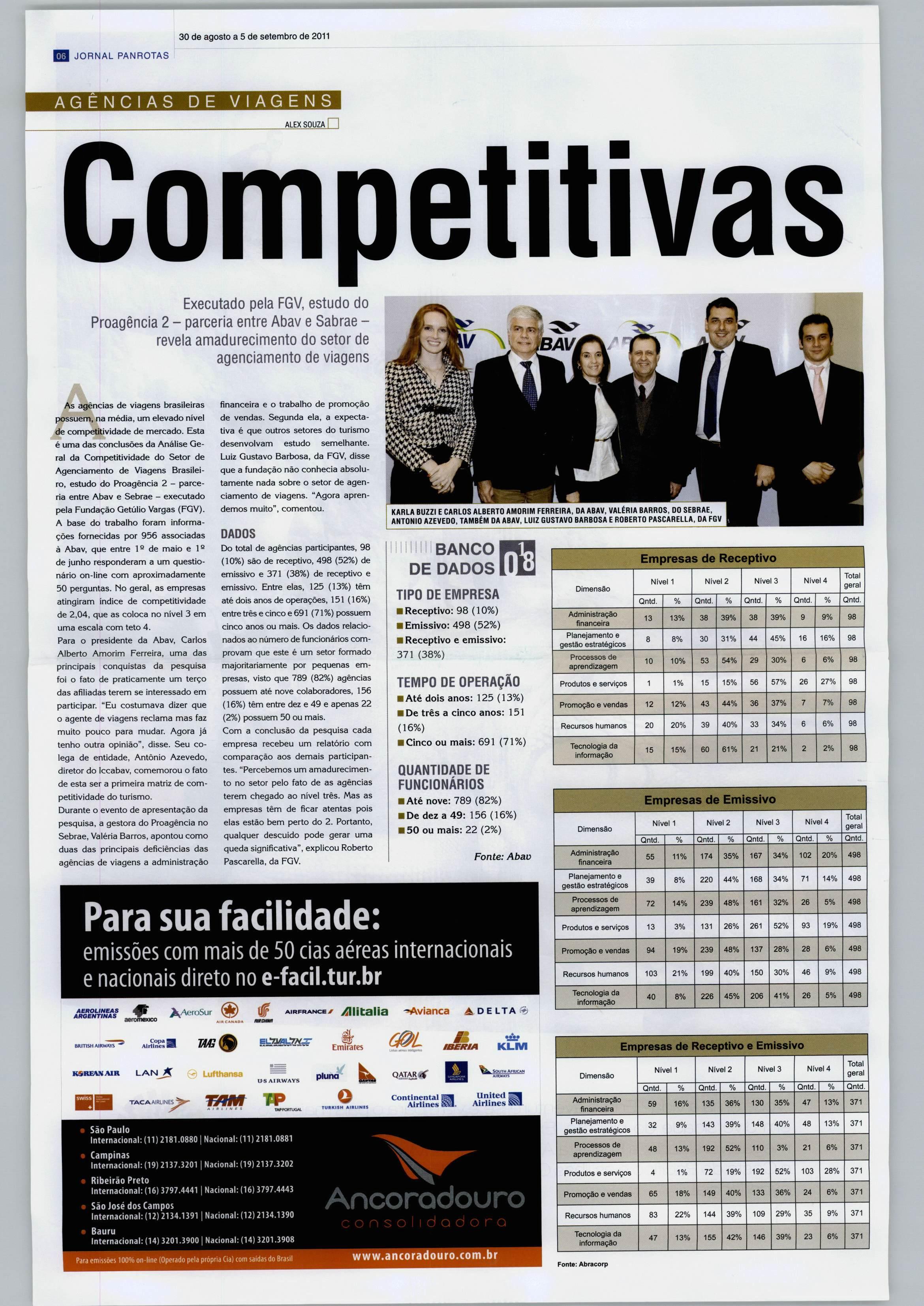 As eí^ncías deviagensbrasileiras p^suem, na média, um elevado nível de competitividade de mercado. Esta é uma das conclusões da Análise Ge ralda Competitividade do Setor de Agenciamento deViagensBrasilei ro, estudo do Proagência 2- parce ria entre Abav e Sebrae - executado pela Fundação GetúlioVargas(FGV).