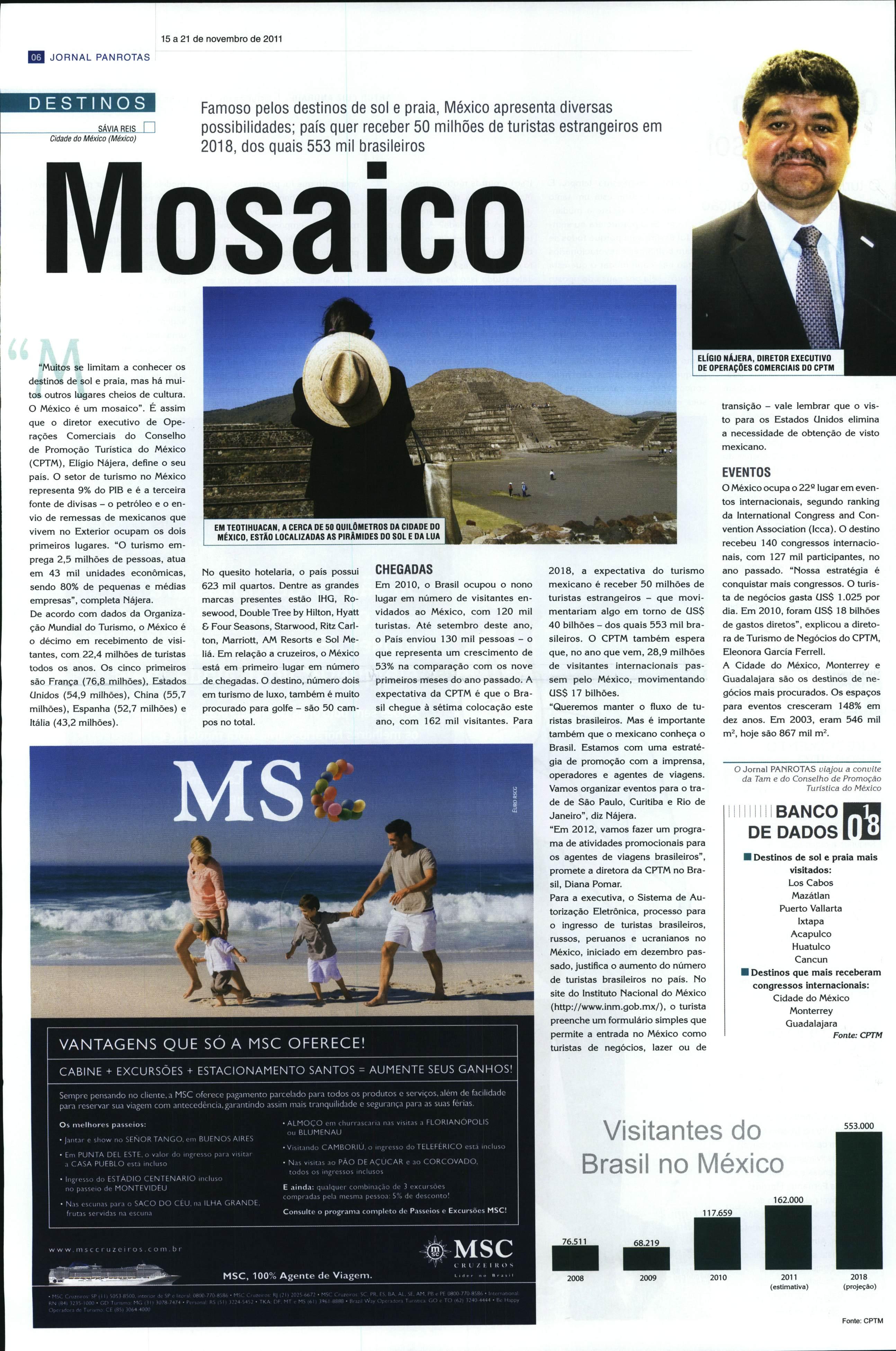 "Muitos se limitam a conhecer os destinos de sole praia, mas hámui tos outros lugares cheios de cultura. O México é um mosaico". E assim que o diretor executivo de Ope rações Comerciais do Conselho de Promoção Turística do México (CPTM), Eligio Nájera, define o seu país. O setor de turismo noMéxico representa 9%doPIBeéa terceira fonte de divisas -o petróleo eo en vio de remessas de mexicanos que vivem no Exterior ocupam os dois primeiros lugares. "O turismo em prega 2,5 milhões de pessoas, atua em 43 mil unidades econômicas, sendo 80% de pequenas e médias empresas", completa Nájera. De acordo com dados da Organiza ção Mundial do Turismo, o México é o décimo em recebimento de visi tantes, com 22,4 milhões de turistas todos os anos. Os cinco primeiros são França (76,8 milhões), Estados Unidos (54,9 milhões), China (55,7 milhões), Espanha (52,7 milhões) e Itália (43,2 milhões).