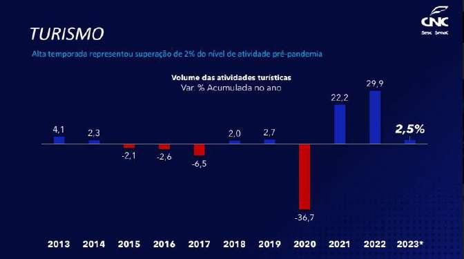 De acordo com dados da CNC, o setor de serviços registrou alta de 8,3% na comparação ano a ano e sustentou o crescimento do Brasil em 2022. Enquanto isso, o volume de atividades turísticas cresceu 29,9% comparado a 2021. A alta temporada de verão, por exemplo, representou superação de 2% do nível pré-pandemia. Em dezembro, o Turismo registrou R$ 41,79 bilhões em receita, representando o maior montante para meses de dezembro da série histórica.