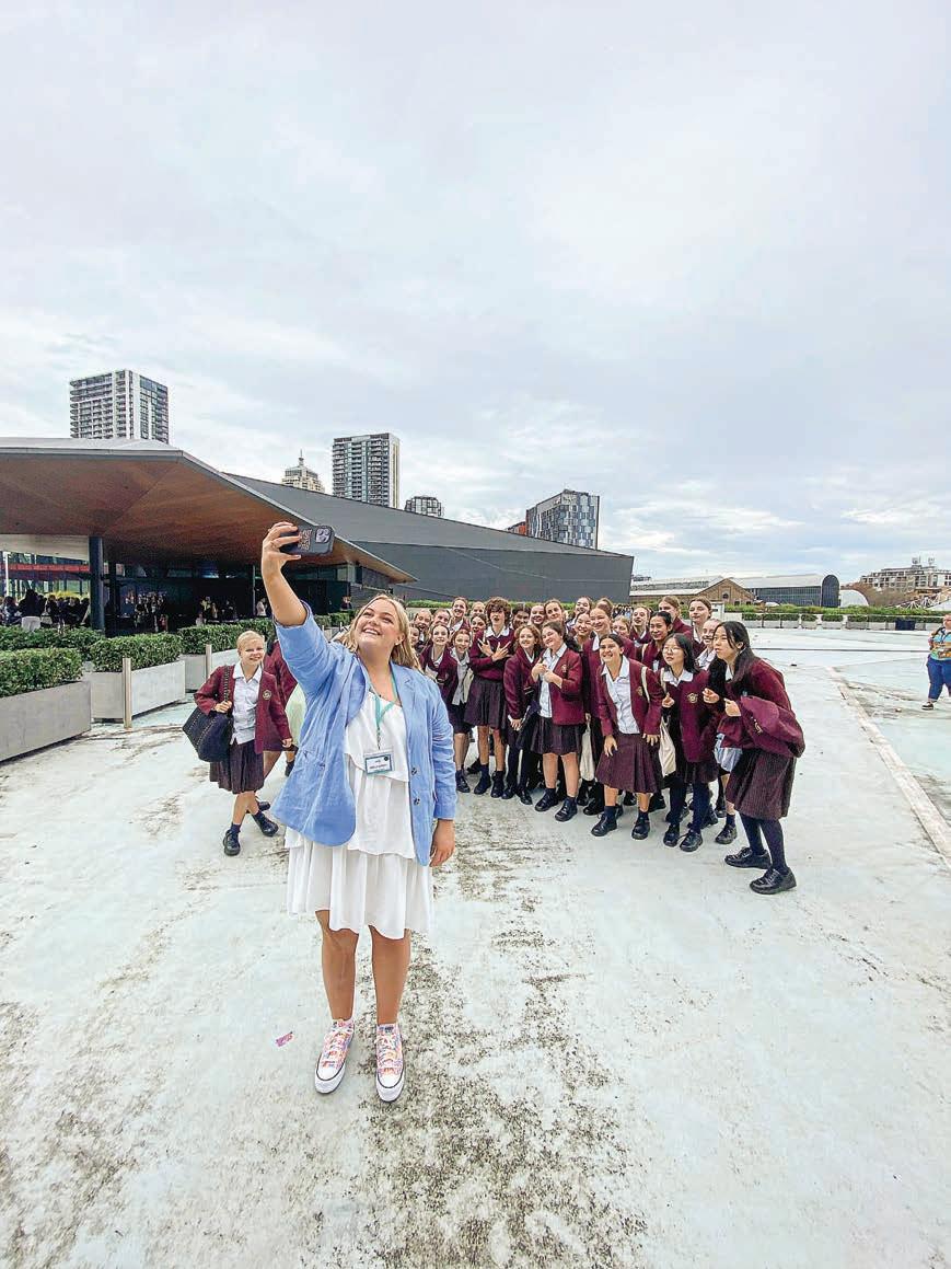 Molly Croft capturing a selfie with a large group of enthusiastic school students at the Stand Tall event in Sydney.