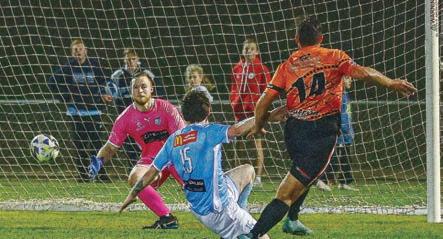 Left and below left: Scott Fox and keeper Hayden Williams can’t stop MUFC’s Tristan Waters giving his team a 2-nil lead.
