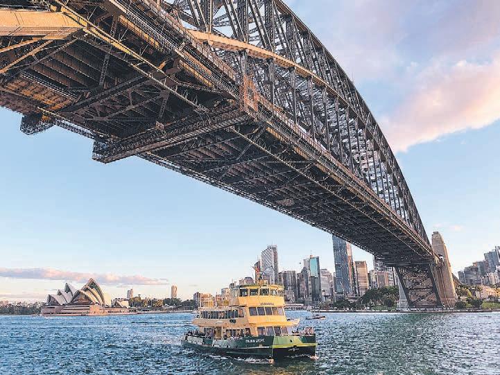 Name of ferry has changed. Part of bridge missing on far left side. Smaller boat to the right of ferry gone. Pilon at the end of the Harbour bridge has an extra spire on top.