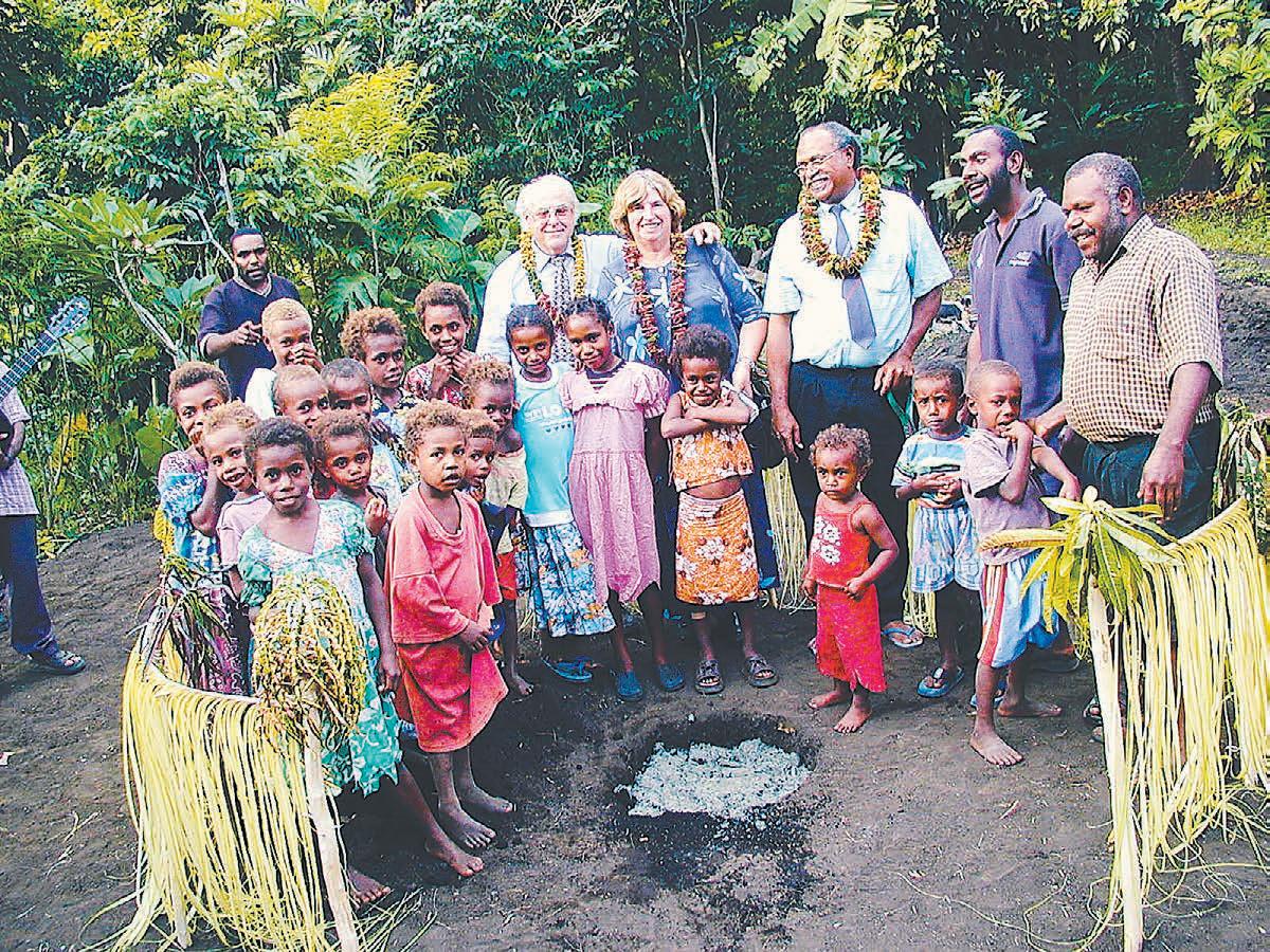 Graham and Pam McLennan, standing at back middle, laying the foundation stone for Christian Radio in Lenakel, Tanna Island, Vanuatu.