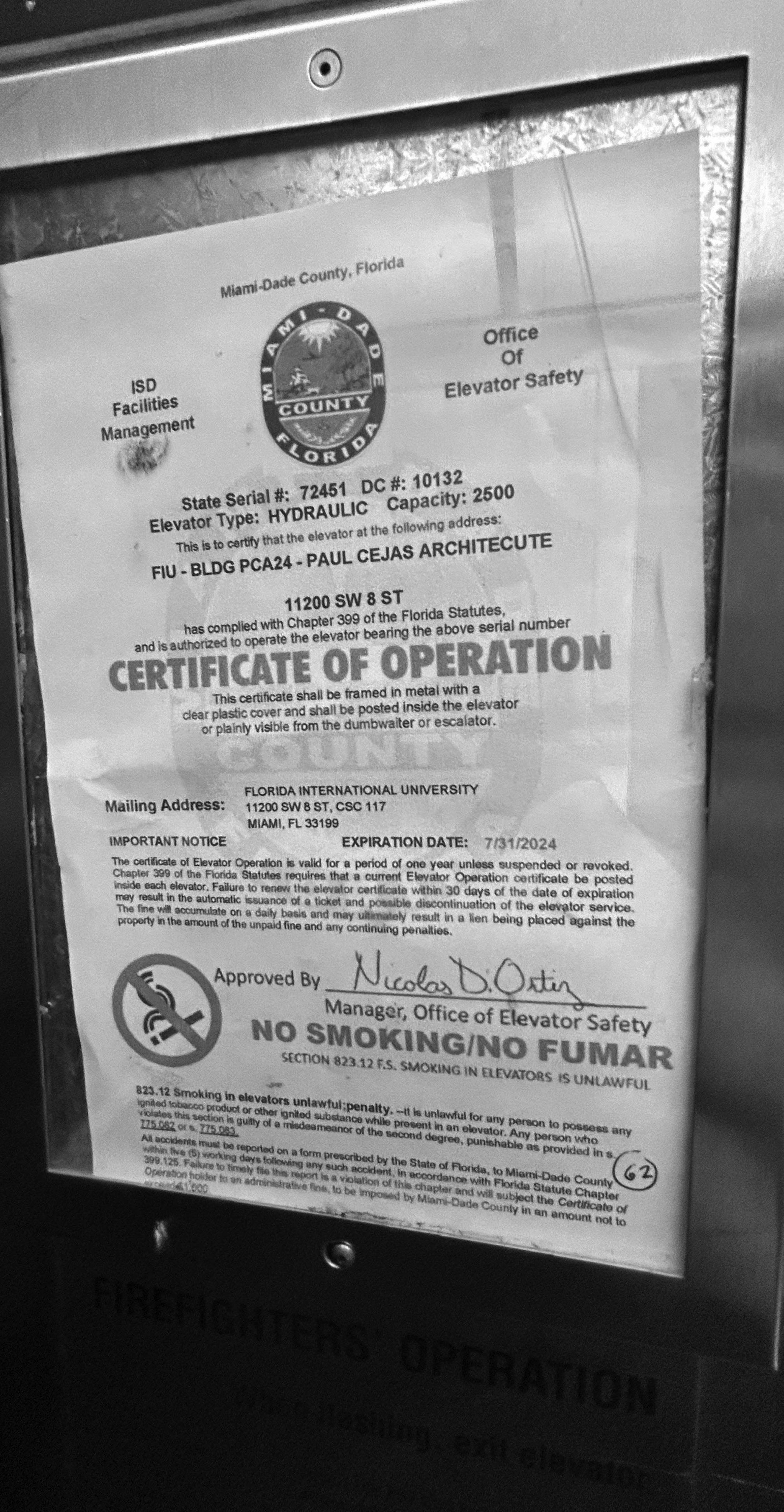 If FIU is running behind on posting certificates to certify the safety of its elevators and those certificates are the only way anyone can know that his or her ride won’t end in disaster, shouldn’t they let students know?