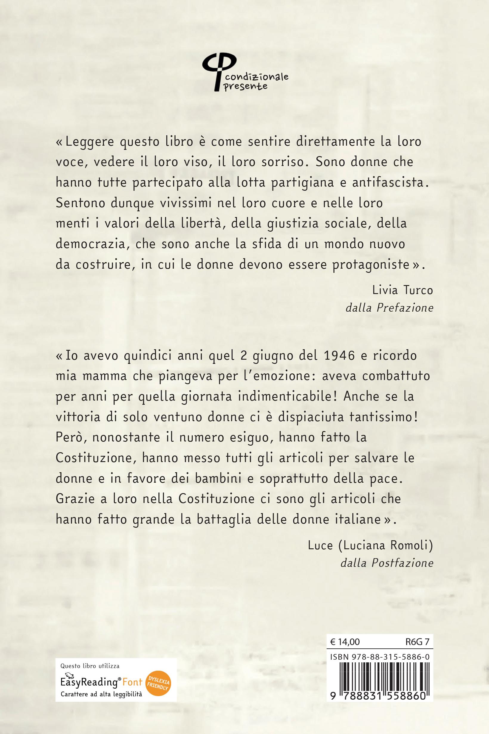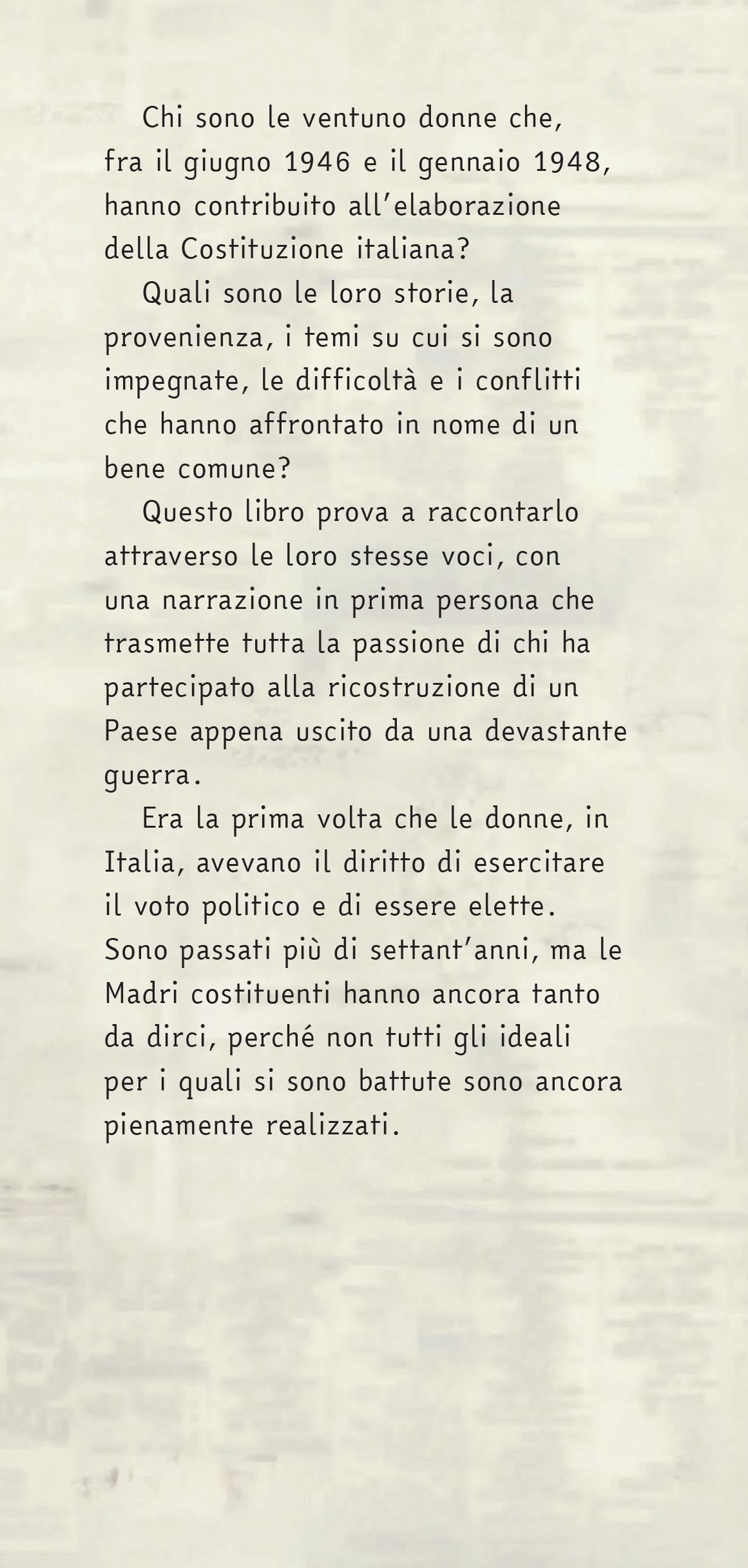 vi incoraggio a leggere questo libro perché vi parla di una pagina importante della storia del nostro Paese che resta ancora poco conosciuta: i nomi, la vita, le opere delle donne che hanno contribuito a scrivere la nostra Costituzione.