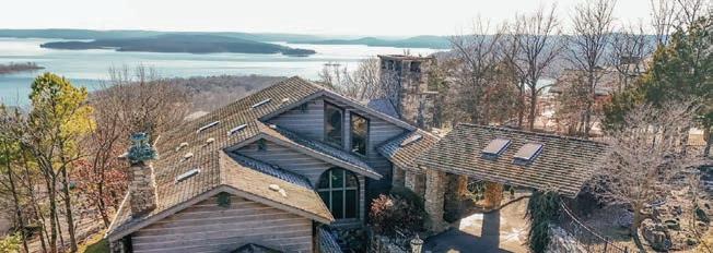 Experience unparalleled luxury at this breathtaking estate where Old World artistry meets exceptional American craftsmanship, nestled within an exclusive gated community with top-tier amenities and panoramic views of Table Rock Lake. Spanning 13,800 square feet across four levels, this extraordinary residence boasts eight bedroom suites, creating the ultimate retreat for grand gatherings and lavish entertaining. A picturesque half-moon driveway framed by wild ivy leads to a vaulted, wooden-beamed entryway with skylights, opening to a majestic stone staircase surrounded by lush landscaping and intricate tailored metalwork. Built with hand-hewn chink logs, local stone, and a shake roof, the home exudes timeless elegance, while inside, a grand living space showcases a custom floor-to-ceiling stone fireplace crowned with a one of only two in existence terracotta A-B eagle from Chicago, dating back to the early 1900s. The one-of-a-kind stained glass windows, large picture windows, and colossal hand-hewn vaulted ceilings create a cozy and inviting setting. GORGEOUS