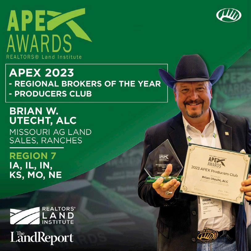 BRIAN UTECHT: Brian continues to lead his team with passion and innovation. He was honored as the top agent in the nation and state of Missouri at the 2023 national sales meeting, compliments of his leadership of our amazing team. Brian also achieved his ALC (Accredited Land Consultant) in 2023, adding to his arsenal for offering our clients the best possible representation with buying and selling land. Brian and his wife, Jill, have purchased a new farm on Table Rock Lake where they are building a home. They greatly enjoy family time with their son, Brock, and daughter, Brianna, at the lake and their farm. They also continue to have fun traveling and watching their daughter compete in college track and field.
