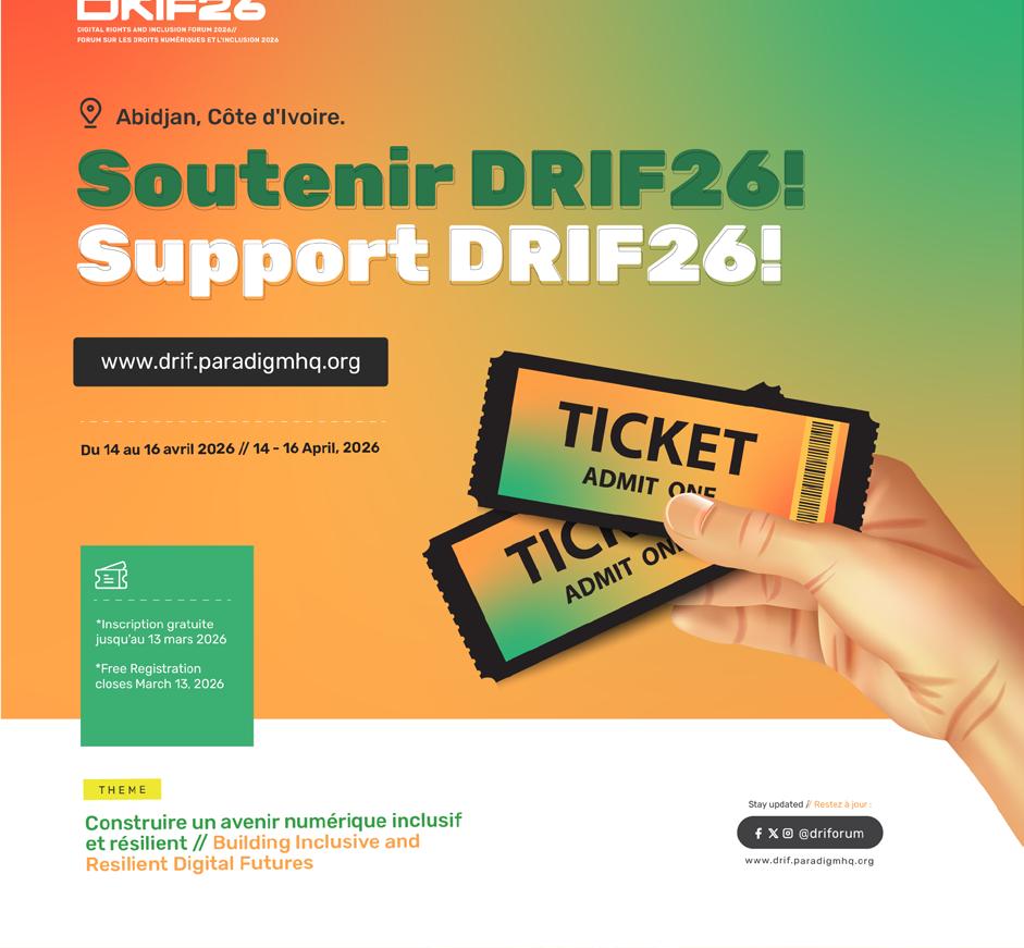 Our flagship event, the Digital Rights and Inclusion Forum (DRIF26), is coming to Abidjan this April, and you can be part of this movement in a meaningful way. Every year, participants leave the Forum inspired, empowered, and ready to make change in their communities, and this year, we are taking the experience a notch higher. By purchasing a Supporter’s Ticket, you are not only helping sustain, but also grow this vital platform. Your contribution ensures that we can continue to connect thousands and expand opportunities for youth, activists, and digital pioneers across the continent. This is more than a ticket. For