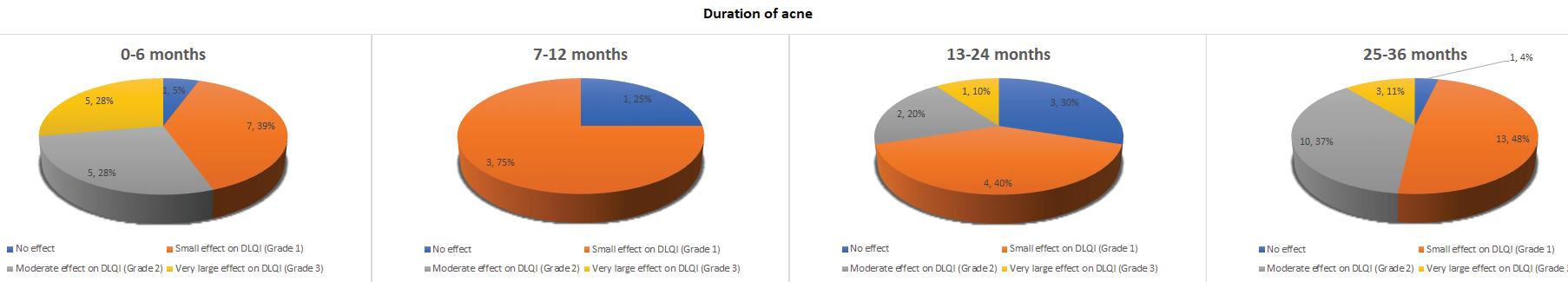 Figure 8: Distribution of Dermatological Quality of Life (DLQI) based on duration of acne symptoms.