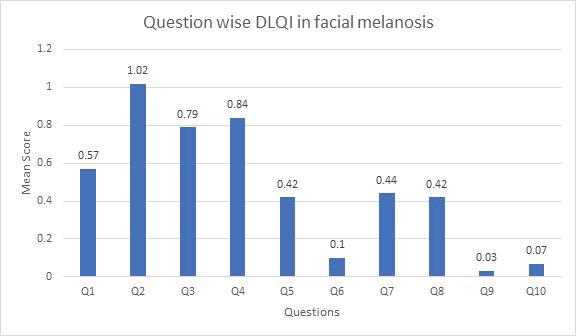 Result: Total 161 patients with facial melanosis were evaluated of which 103 (63.98%) were females and maximum 98 (60.87%) were in 19-40 years of age group. Melasma was the most common condition with 70 (43.5%) cases followed by postinflammatory pigmentation with 15 (9.3%) cases. Maximum 80 (49.68%) patients are categorised as a small affected DLQI group. Out of total 10 questions, question 2 (How embarrassed or selfconscious have you been because of your skin?) had