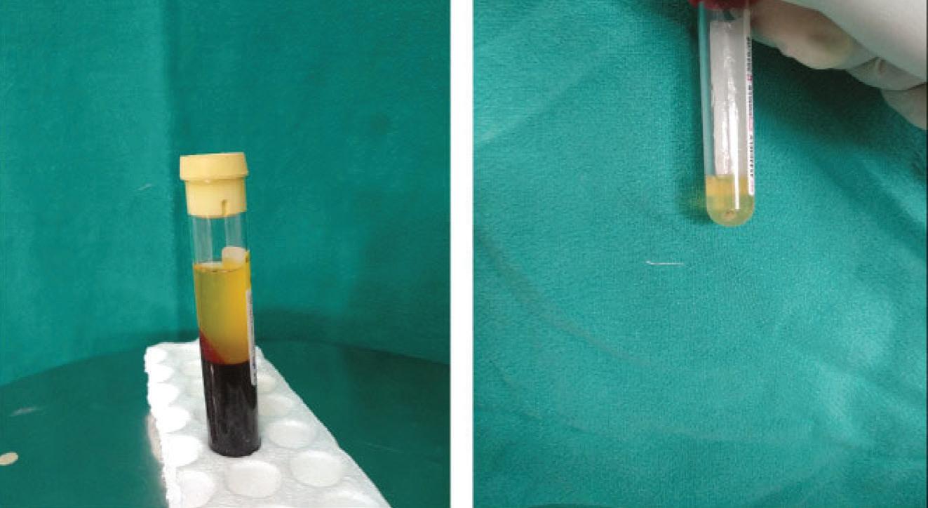 fourth of the plasma formed at the bottom of the vial. Calcium gluconate was added as an activator in a ratio of 1:9, i.e., 1 mL of calcium gluconate in 9 mL of PRP. 8 This is higher concentration of platelets.14