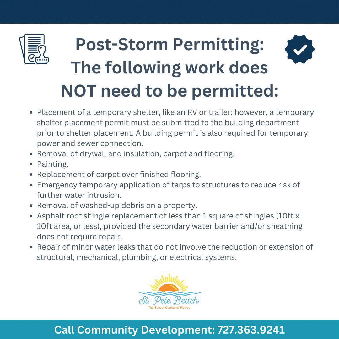 In SPB the emergency permitting period started Sept. 23 and runs to March 2025. The one-day permit review will be prioritized for demolition, roof, windows/ doors, garage doors, electrical repairs including panel/meter, dock, pool, and water heaters. Properties damaged by Helene will get prioritized technical review.