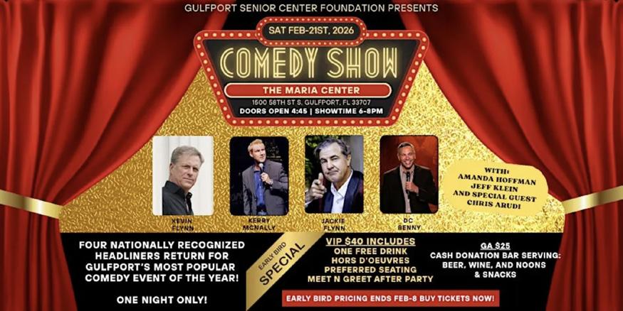 Gulfport Senior Center Foundation presents Loudermilk’s Jackie Flynn Headlining an All-Star Comedy Night. Fresh off his standout role on the hit series Loudermilk, comedy veteran Jackie Flynn headlines an unforgettable night of big-city stand-up. Four Nationally Recognized Headliners for One Night Only! Saturday, Feb. 21 at The Maria Center, 1500 58th St. S, Gulfport. Get ready for one of Gulfport’s most popular comedy events of the year! Four nationally recognized comedians return to the Maria Center Stage for a night packed with big laughs, sharp wit, and unforgettable performances. Headlining the evening is Jackie Flynn, best known for his standout role on the hit series Loudermilk, joined by three audience favorites who brought the house down last year: Kevin Flynn, Kerry McNally, DC Benny. This is a one-night-only comedy event in an intimate theater setting – perfect for date night, group outings, or anyone who loves smart, grown-up comedy.