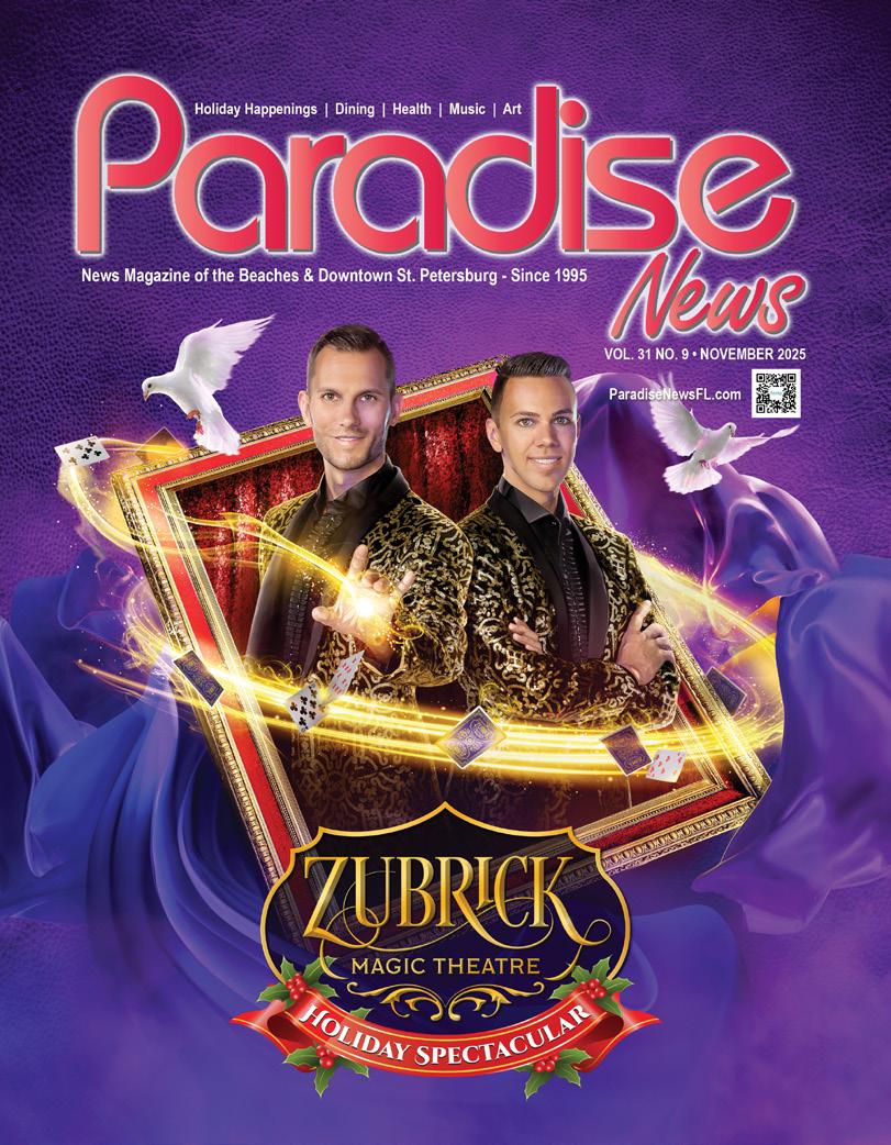 We are proud that our team, which includes many local writers, of which some who were also affected by last year’s storms, were able to meet every deadline and publish all 10 issues of Paradise News on schedule since Helene’s visit. New readers might discover the Arts and Leisure and Events columns, 14 pages of free listings, often starting on page 39, with a list of 20 entertainment categories, carefully updated monthly by Buddy Baker, providing the most comprehensive entertainment calendar in Tampa Bay, in print and online.