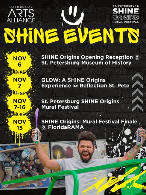 Now celebrating its 11th year, the SHINE Mural Festival Nov. 7-16, brings bold public art to the streets of St. Petersburg. This year’s Origins theme features all local muralists, spotlighting the creative talent within our city and the lasting impact of public art on our community. SHINE 2025 kicks off Nov. 6, 5:30-7pm with an opening reception at St. Petersburg Museum of History! Join us for an evening with this year’s SHINE artists as we celebrate the start of the festival. Explore select works on display, meet the artists behind the murals, and get a glimpse into their creative process before their art hits the streets.