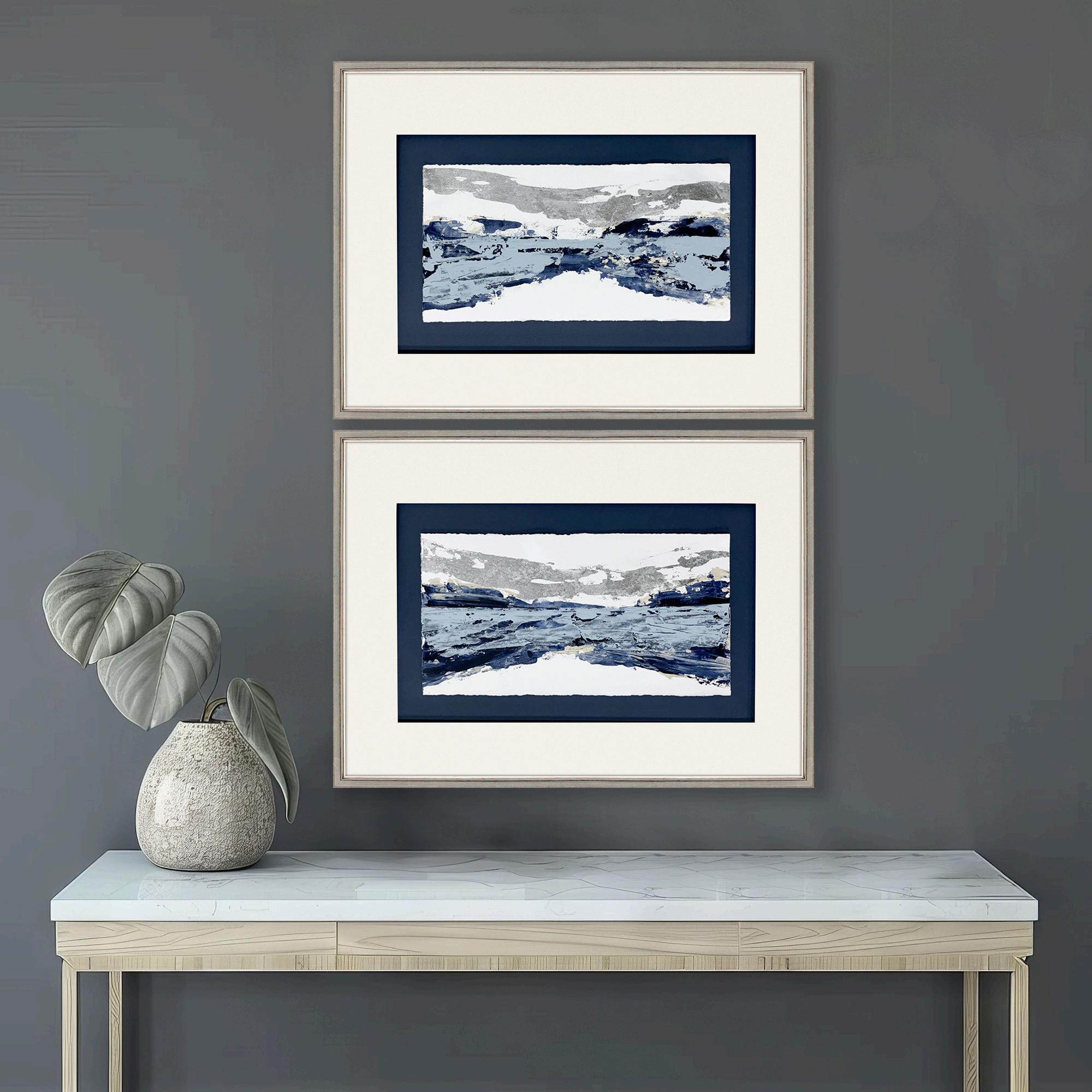 Exclusive mixed media collage with handmade papers and silver leaf accents. Framed in a silver leaf wood shadow box with gold wash edging