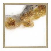 Exclusive reverse hand painted on acrylic with gold mica flakes. Framed in a lacquered white wood shadow box style with a champagne gold wood liner