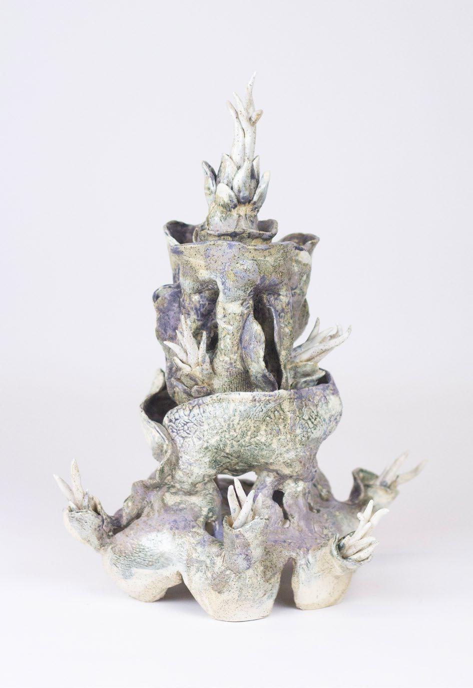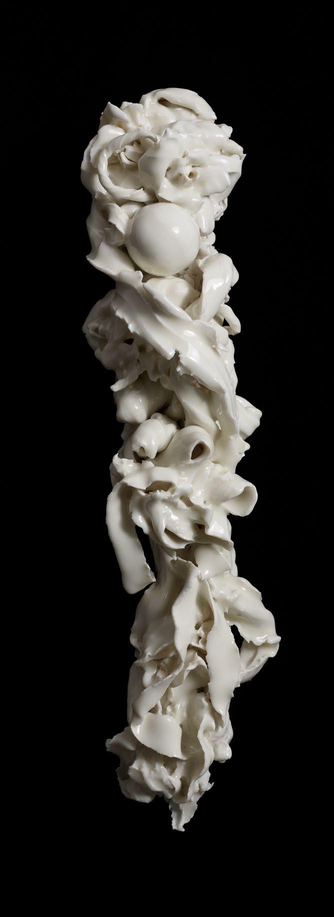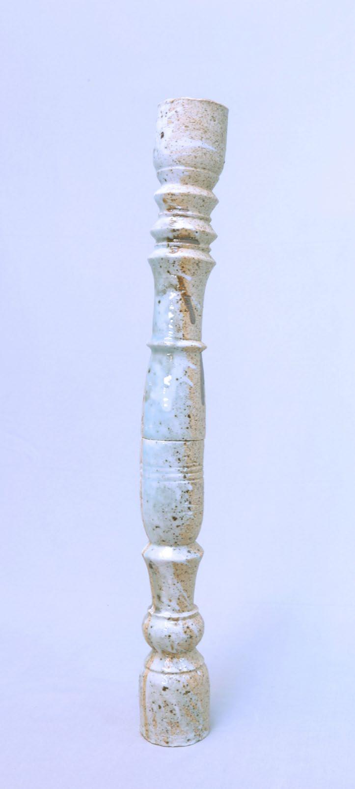 In 2024, Jaffa Lam embarked on a year-long residency dedicated to ceramics in Longquan, China. Best known for its long history of celadon (a type of green-glazed ceramics), Longquan allowed Lam to investigate the medium of ceramics and glazing in unprecedented ways. During her residency, Lam created Windbreak Tree, a new series of ceramic works. This particular work is a smaller version of a larger sculptural installation, which will be featured at the upcoming Shanghai Biennale in November 2025. Drawing from Lam’s own artistic interest in culture, history, and material memory, Windbreak Tree comprises a number of modular ceramic pieces—ranging in size from ten centimeters to over three metres—which can be put together as a series of sculptures. When separated, the modular pieces resemble domestic objects, such as candlesticks or vases. However, when assembled, the sculpture emulates the form of a stair rail which are often found in old Shanghai townhouses. For the artist, this form evokes a protective railing that withstands the wind. Each piece bears the marks of the firing process from its creation; although the work itself bears a slight backward bend, the piece appears to hold steady, seemingly in the face of an unseen force.