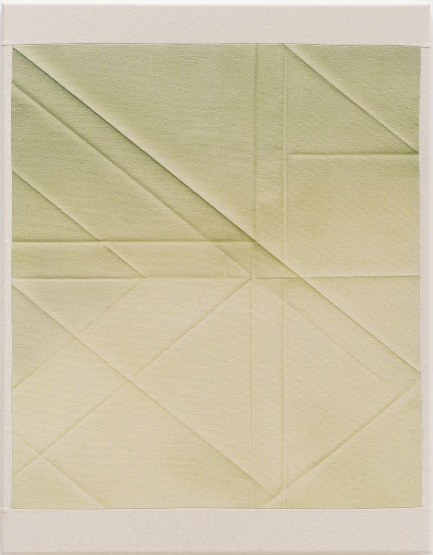 Echoes of Memory is one of Monika Žáková’s most recent series, focusing on recording the traces and imprints of time and the pressure on canvas. She captures, in sophisticated and sensitive detail, an illusionary sense of three-dimensional depth on her two-dimensional works—first by crumpling, pressing, stretching, and ironing the raw, unprimed canvas to her desired pattern, and then by precisely rendering upon it her observations of the falling light in soft acrylic gradients that involve up to a dozen individual shades. Once stretched back into shape, the resulting work is an extremely subtle recording of the interplay of light, form, and shadow on an exceptionally smooth textile—capturing time and gesture in an eternally fixed moment. This tension between the artwork’s appearance and real nature, evokes the way the precise structural proportions of a fleeting moment can be recorded so permanently. It resembles the way the brain stores, constructs, and eventually reconstructs memory. This relationship is further blurred by Žáková’s presentation of her expertly rendered compositions within a sewn frame of canvas strips, complicating where the recalled illusion ends and actual reality begins.