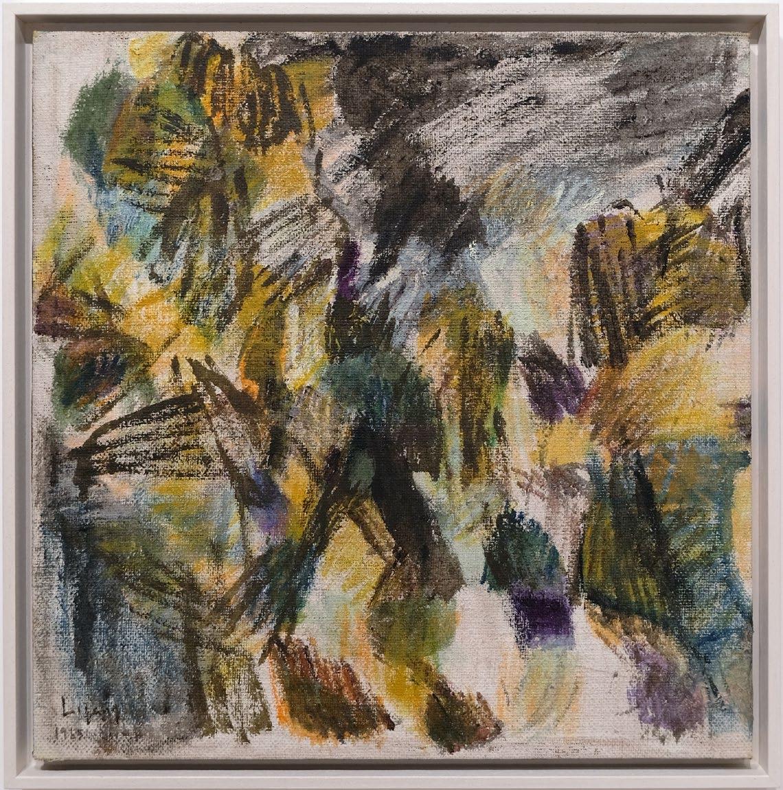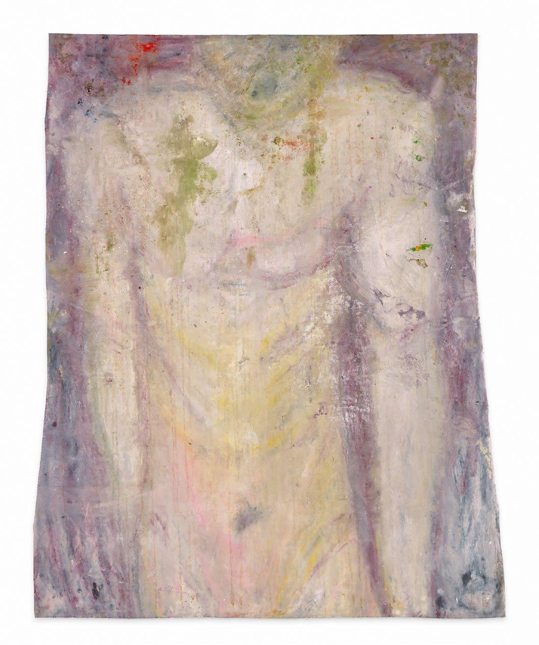 In this untitled work from her solo exhibition of ‘my life’ at Kunsthalle Basel, Ser Serpas turns to painting as a site of fragility and transformation. The canvas presents the suggestion of a torso, its contours dissolving into washes of muted violets, yellows, and greys. Rather than fixing the body in clear representation, Serpas allows it to blur, drift, and reconfigure, as if caught between emergence and disappearance. The surface bears traces of accumulation and erasure, its layered pigments evoking the passing of time and the instability of memory. The figure here is less a subject than a presence—partial, uncertain, and fleeting. In resisting legibility, the work opens a space for projection, where form is both intimate and elusive.