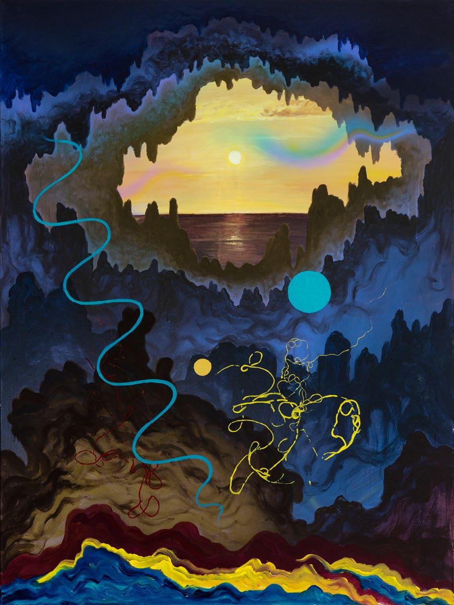 Correa Mejía’s paintings are characterised by vivid hues of deep red and blue, carving out fanciful, dream-like worlds that dissolve into spirals and undulating celestial landscapes. Tracing out the forms of his own inner world, Soledad represents the vitality of the artist’s creative spiritual philosophy through the symbol of the pine tree. A powerful motif, it speaks to the rooted, vertical presence that bridges earth and sky. Like the moon and water, red and blue, and the dual figures that populate Correa Mejía’s world, the pine embodies both natural resilience and spiritual transcendence. Its upward thrust suggests progress and aspiration, while its evergreen quality evokes continuity, fertility, and renewal. Inhabiting this awareness and observing the world from a place of solitude are two of the key actions that illustrate his practice. In his works, Correa Mejía often depicts unknown landscapes that appear almost as an exploration of one’s inner world. These motifs draw from his wider personal biography, and the vulnerability and joy he finds in his homosexual male identity. While personal to him, these experiences allow Correa Mejía to speak to universal human feelings, such as connection to nature, to one’s own body, and the simple, primal ‘awareness of being alive’.