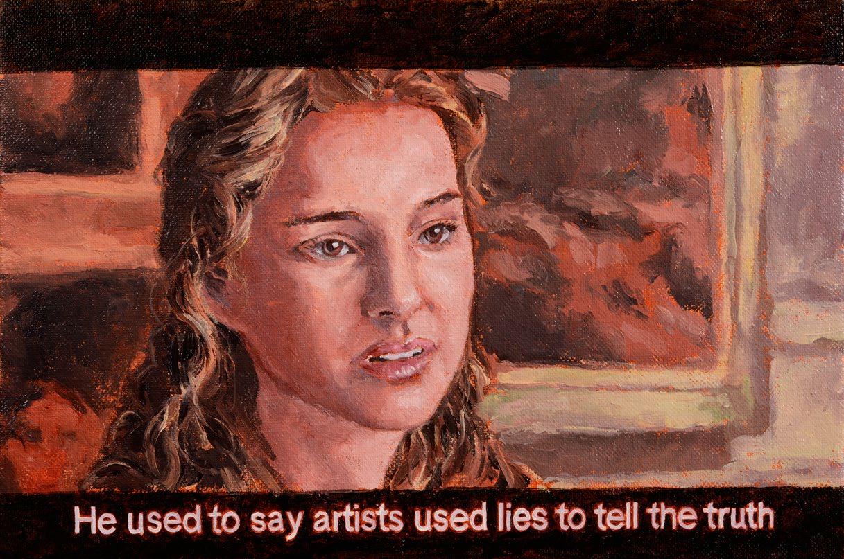 Often depicting the nuances of human relationships through his subtle framing of various interactions, Chen’s paintings often present a glimpse into our interior worlds. In this painting, Chen depicts two men in suits, each holding a snake—one red, one green—poised in a mirrored confrontation. The image centers on their hands and the intertwined serpents, evoking a tension between oppositional forces, power dynamics, or perhaps a fateful entanglement. Here, the deliberate omission of the figures’ full faces draws focus to their gestures and symbols, inviting viewers to contemplate the larger, systemic structures these anonymous characters represent.