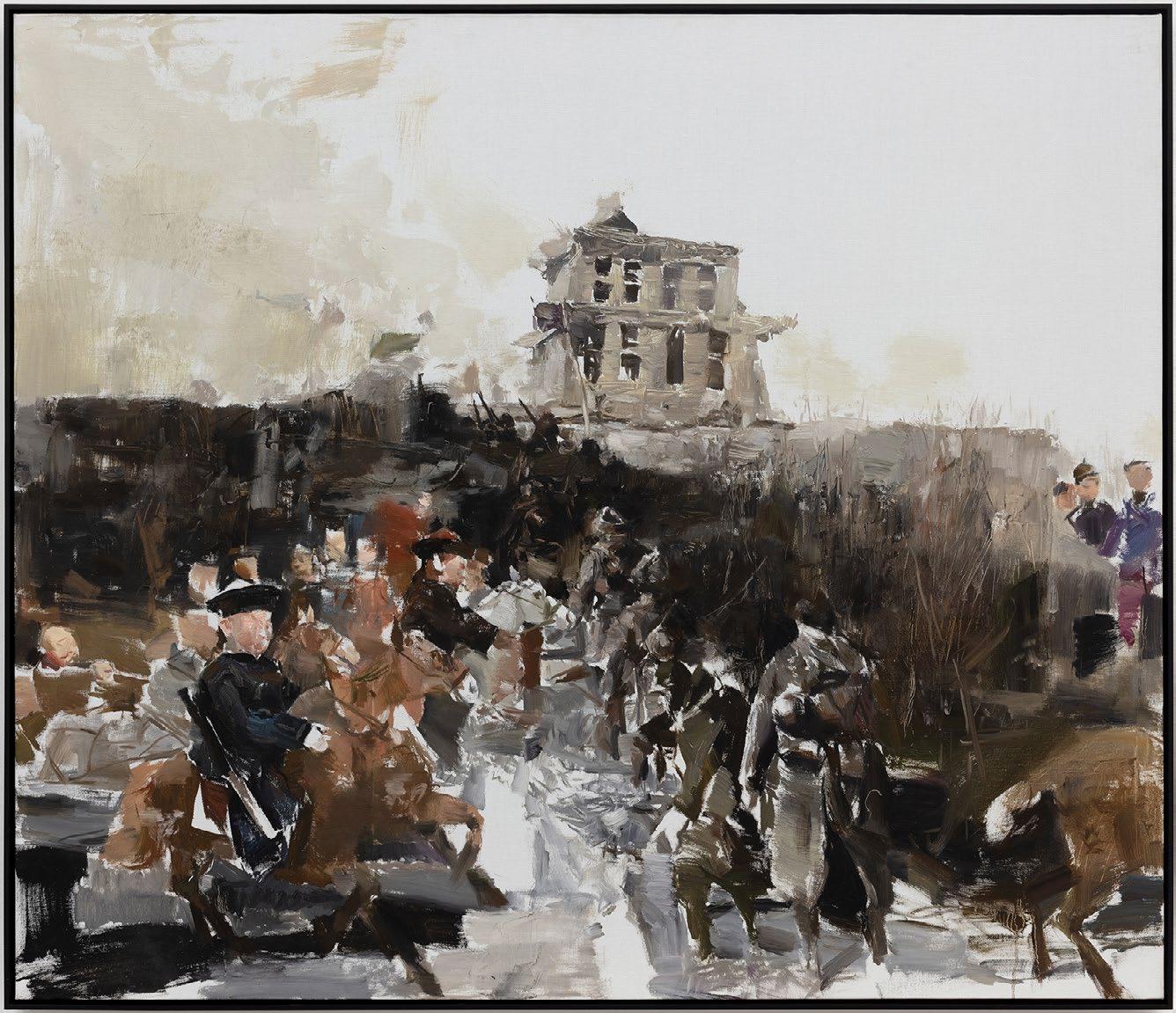 No Fields Fallow the Four Seas Over transforms the quaint landscapes of southern China into uncanny scenes, reflecting the rapid cultural, social and economic change that has taken hold of much of rural areas. In the foreground, a single, lone figure is portrayed overlooking agricultural fields, his back turned towards us. Depicted in sombre colours, the artwork reflects a sense of helplessness and alienation. Through evoking a sense of eerie stillness, it espouses a broader sense of defamiliarisation, as though a once-familiar scene has now become strange and foreign to its viewer. Often addressing issues resulting from the economic boom of the later twentieth century in mainland China, Wu’s artistic practice is inspired by daily scenes in the artist’s hometown, giving voice to the tensions between tradition and modernity with poetry and poignancy.