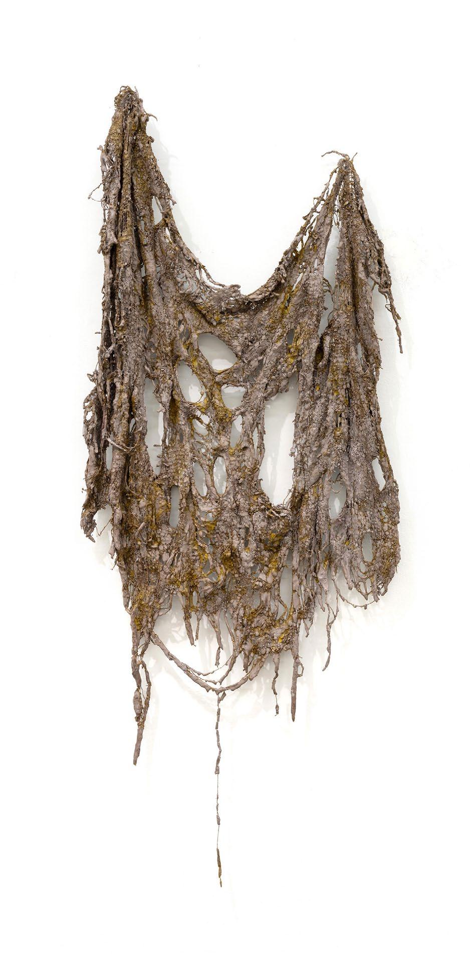 This hanging sculpture by Mire Lee powerfully embodies her ongoing exploration of intimacy, consumption, tactility, violence, and the female body. Its visual and sensory elements draw inspiration from ‘vore’ (vorarephilia), a fetish involving the consumption or swallowing of another person as an extreme expression of affection or desire for closeness. Defying categorisation, Lee’s idiosyncratic works exude an energy that is entropic, polarising, enticing, and nauseating. They challenge notions of selfhood, social acceptability, and cleanliness, obliterating societal conventions of aesthetics and desire. This work typifies Lee’s interest in the visual appearance of skin, a motif that has recurred throughout the artist’s practice since her first major solo institutional exhibition at ArtSonje (2021). Created from burlap dipped in slip clay, the work resembles skin, the main boundary between the inside and outside of our bodies. Appearing as though torn, or flayed, the work transgresses dichotomies of industrial and organic, interior and exterior, beautiful and grotesque.