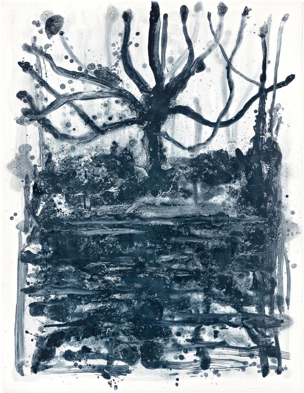 Indigo Forest is a series of lithographs by Shinro Ohtake inspired by his memories of the forests in Kassel, Germany, where he exhibited at Documenta 13 in 2012. Rendered in monochrome, these works move from depicting a specific place to evoking an abstracted landscape shaped by memory. Repetition of past imagery, filtered through recollection, is central to Ohtake’s practice, and printmaking’s multiplicity amplifies these recollections. This work was executed during Ohtake’s residency undertaken at STPI, where he embraced the challenge of creating images with papermaking techniques. During the residency, the artist created a series of works depicting forests and trees. Scenes of nature have been a recurring theme throughout the artist’s oeuvre, and they are captured here in wild, expressive, and monochromatic gestures.