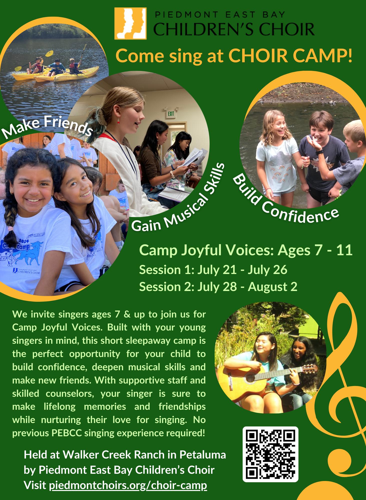 Join choir sleepaway camp! Children are encouraged to sing at the lake, on hikes, and around the campfire. Built with young singers in mind, this weeklong camp is the perfect opportunity for your child to build confidence, deepen musical skills, and make new friends. Multiple Sessions available between: July 21 and August 2. We can’t wait to sing with you! Save your spot: https:// www.piedmontchoirs.org/camp.
