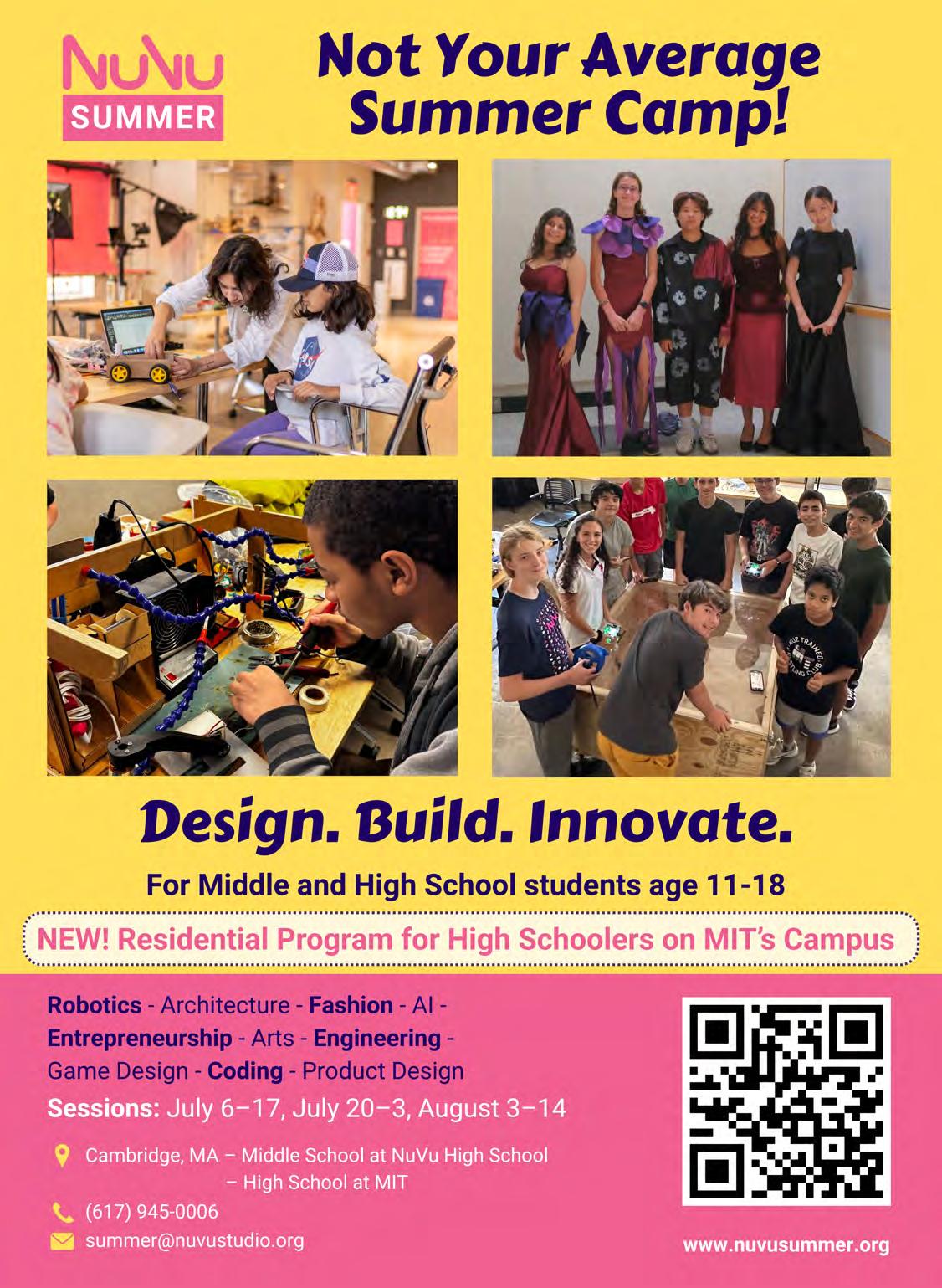 Each two-week session focuses on projects rooted in design, technology, art, and engineering, guided by expert coaches from Harvard University, MIT, and Rhode Island School of Design. With personalized attention and a dynamic environment, every day is engaging and fun! Financial aid is available, and NuVu offers discounts for multiple session sign-ups, siblings, and returning students. Check out NuVu for a summer of innovation and discovery. https://www.nuvusummer.org
