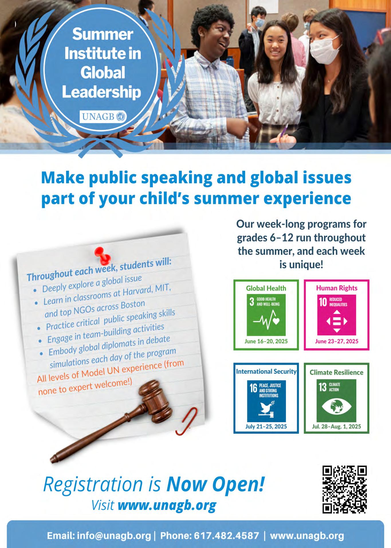 The United Nations Association of Greater Boston’s Summer Institute in Global Leadership offers week-long Model UN programs for students from all over the world to work together and address global issues. Throughout each