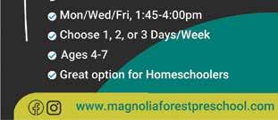 Magnolia Forest Preschool 39 100% outdoors, child-led, play-based education for ages 2.5–7 4 campuses in Sequim, Lynnwood, Poulsbo magnoliaforestpreschool.com; info@magnoliaforestpreschool.com
