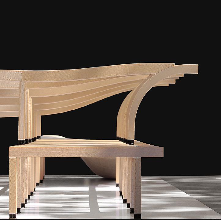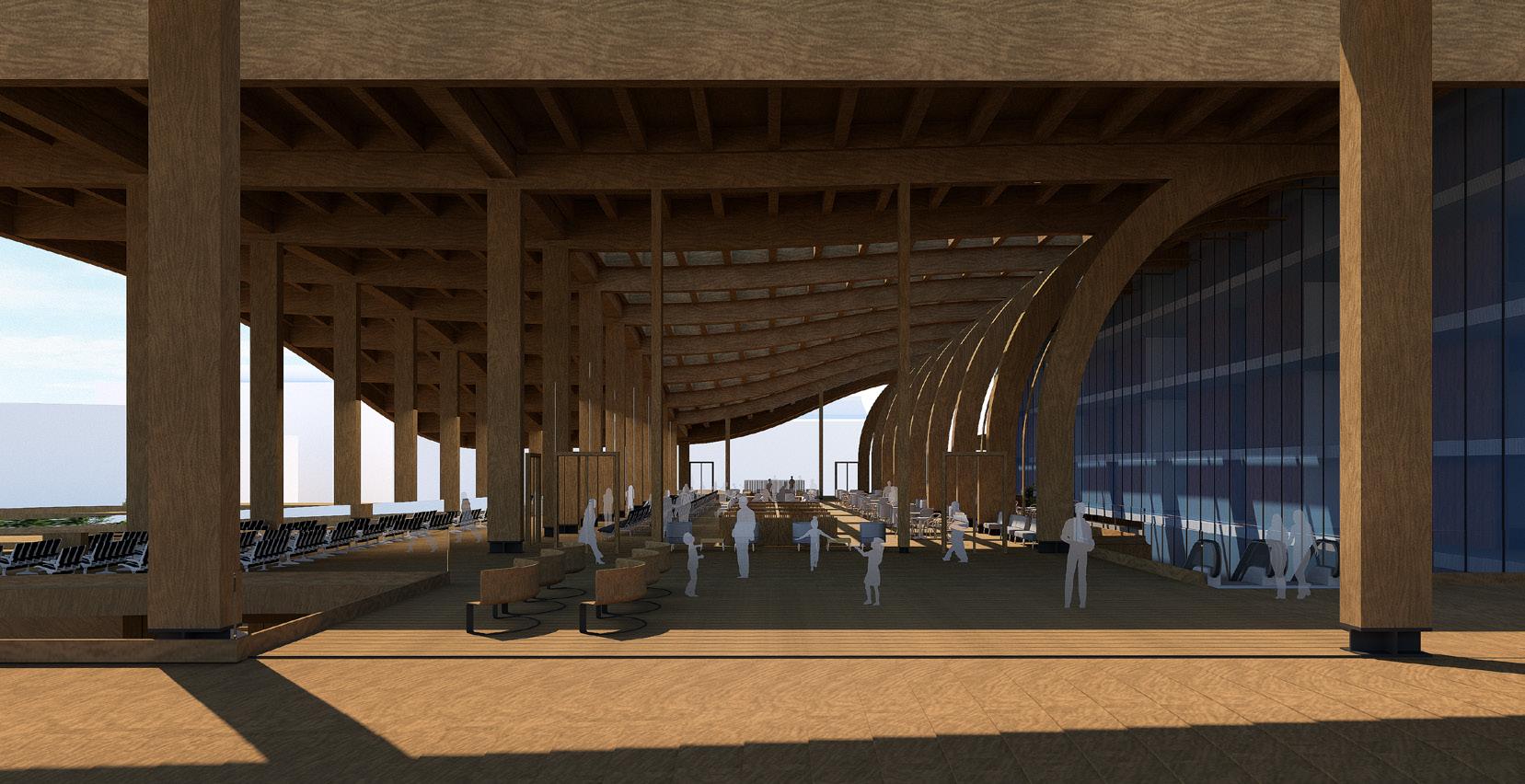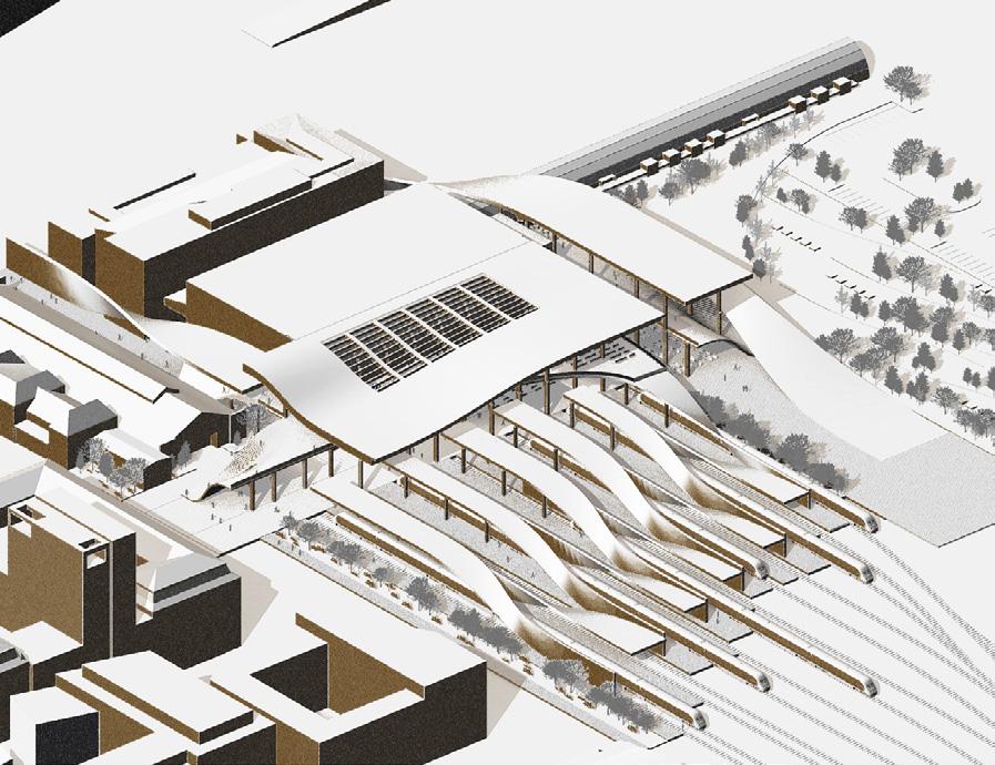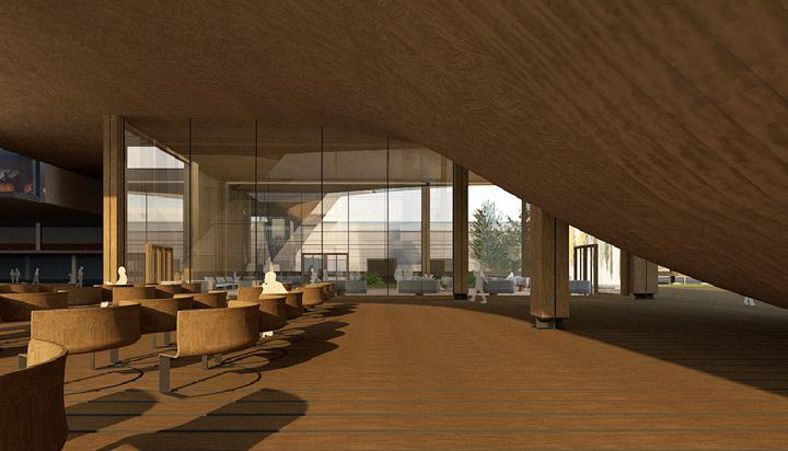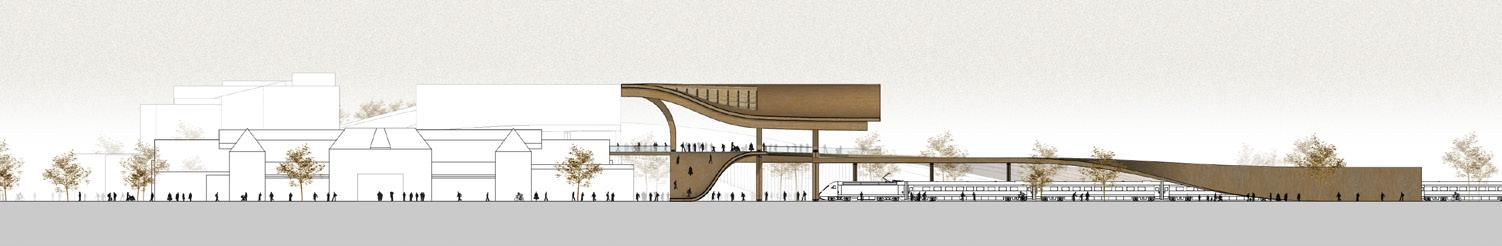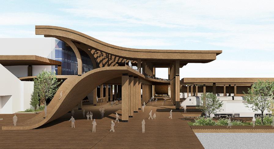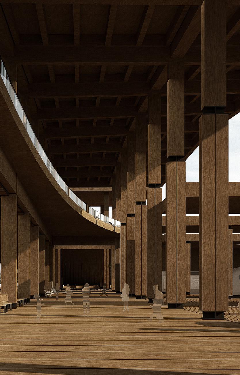 The proposal features the architecture of wooden ribbons and waves rising and wrapping around the old station buildings. It looks like the architecture is giving a warm embrace to its surroundings. The structures are sculpted to be immersive and engaging, encouraging visitors to move through the spaces and experience curves and shadows. With the seamless transition of architectural elements, the undulating forms give the impression of movement and flow, orchestrating people.