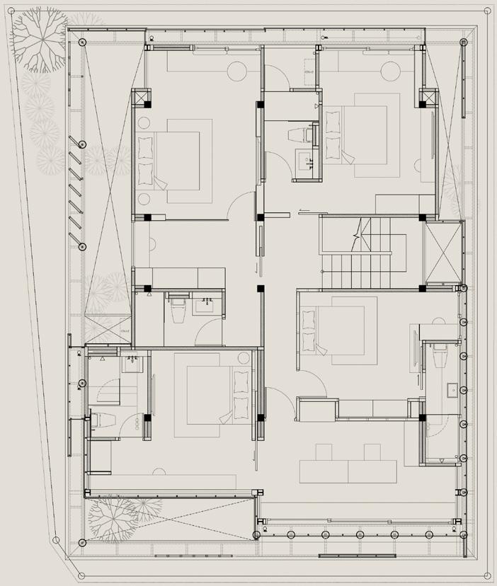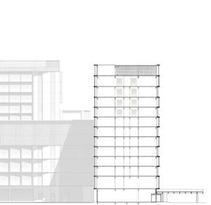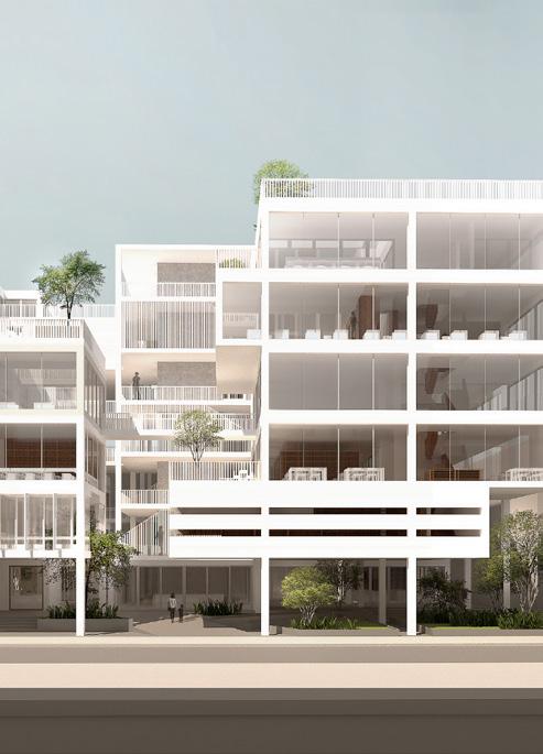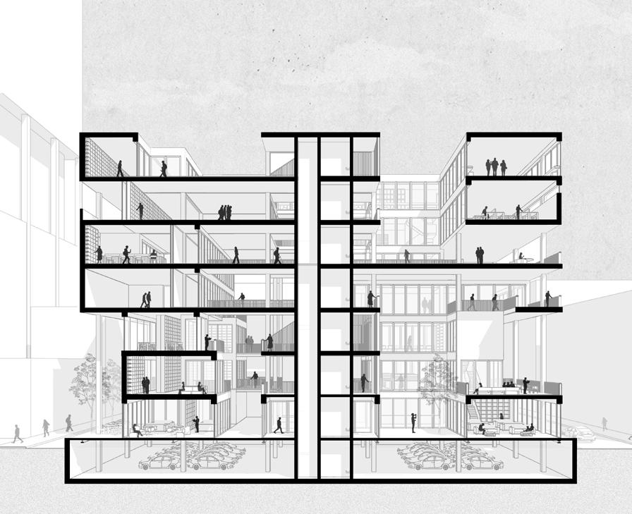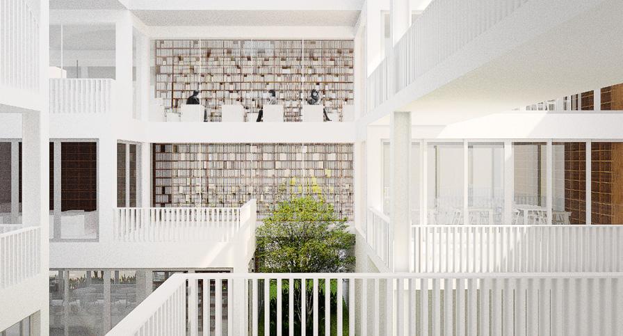 The building’s overall design is characterized by a stack of recessed volumes. The design seeks to create an inviting ambiance. The building’s volume in which levels slide to each other develops stimulating exterior spaces on every floor and creates a green reading environment with sufficient natural light, ventilation, and shade.