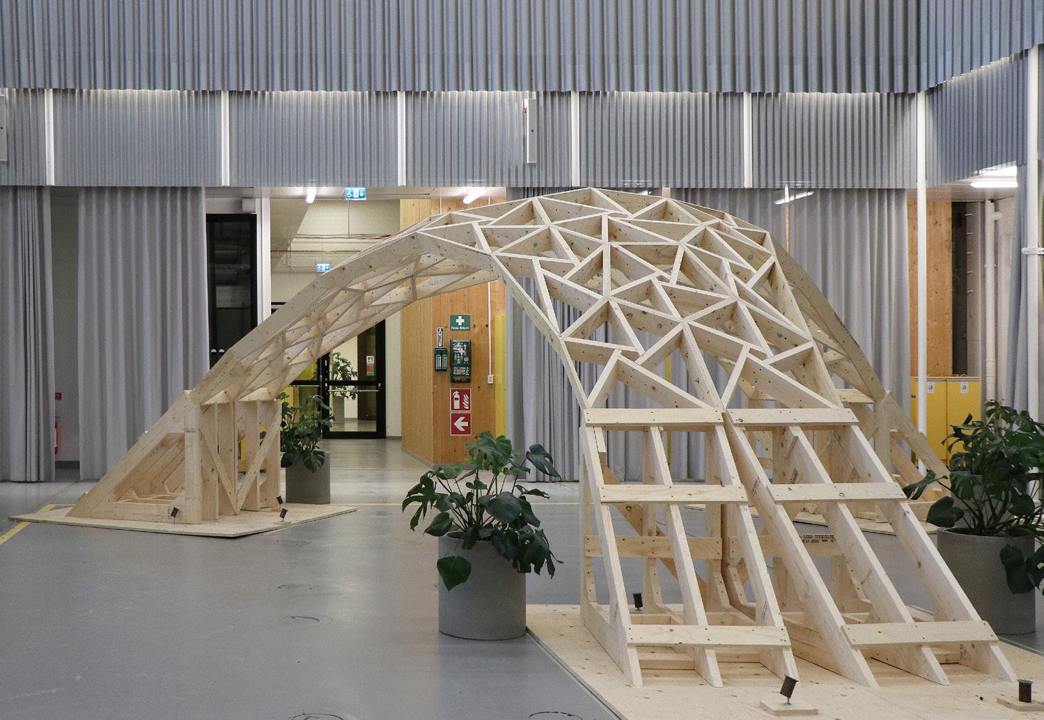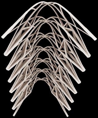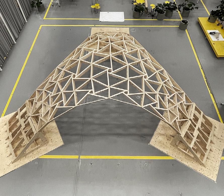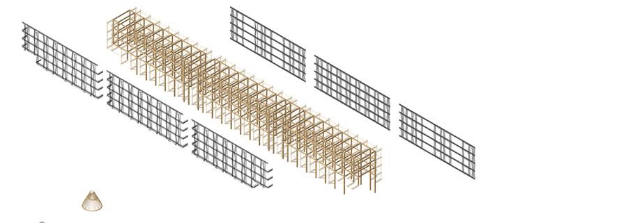 Prototype 1 is concerned with realizing geometric and spatial properties with regard to scale and structural design optimized for an open-plan layout. Iterations of the structure were explored during the development of this prototype. These iterations aimed to investigate different geometric configurations of the structure, all comprising relatively similar framing members. Each one targeted a uniform structure size of 15 x 30 x 8 meters. The arch frame structure emerged as the most promising design for further development into Prototype 2. This particular structure was selected due to its ability to emulate the natural parts of a tree, with members that closely resemble branches and trunks.