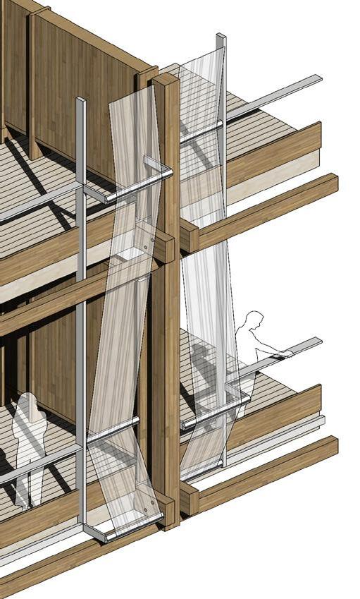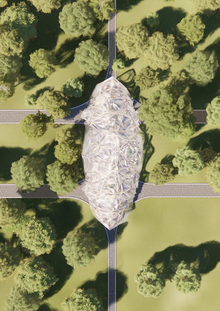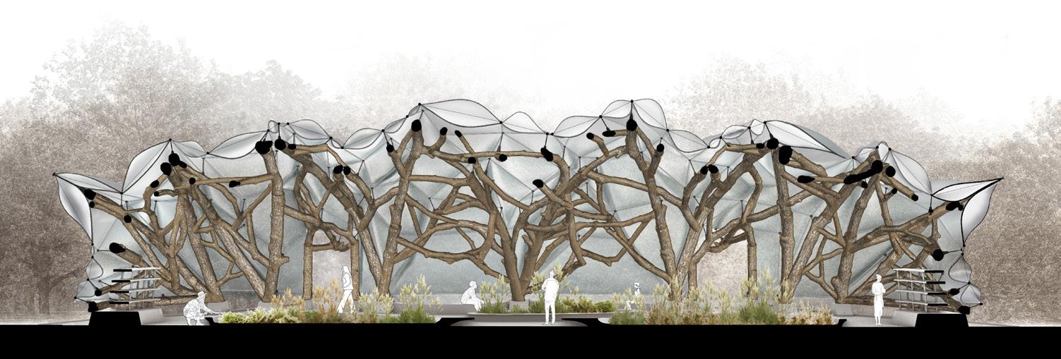 The design proposal illustrates how local resources can be effectively utilized for sustainable architectural applications, with a particular architectural language coming from the appearance of found elements. This final design proposal incorporates the use of two layer inflated ETFE membrane cushion, highlighting the raw timber structure’s capability to support such membranes. The integration of these panels presents a significant challenge, as it involves designing the membrane to complement the structure aesthetically and functionally. The ETFE outer layer is a significant benefit of the membrane design because it protects the raw timber structure from the weather.