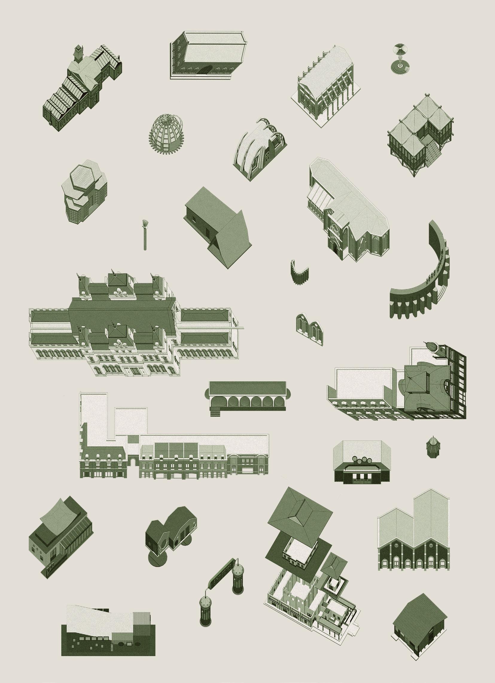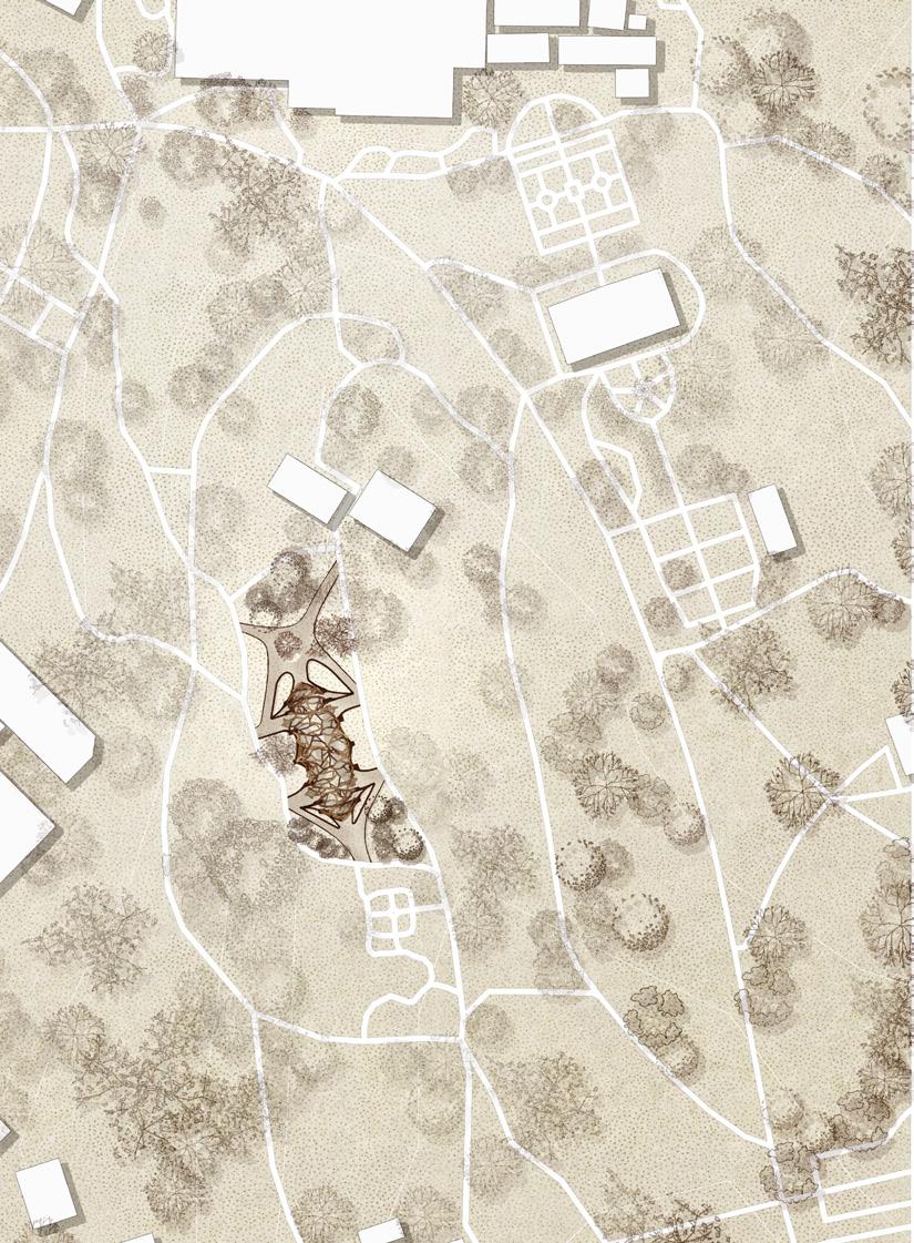The design process involves making sketch models of experimental forms with sublime spaces at the human scale and geometry that demonstrates natural rigidity. It entails adapting each prototype principle and element, in order, to satisfy the particular problematized site without any preconceived ideas.