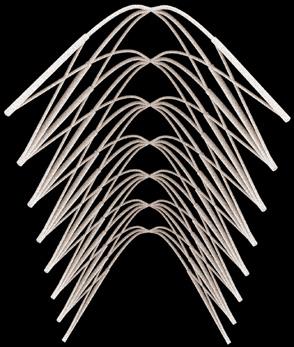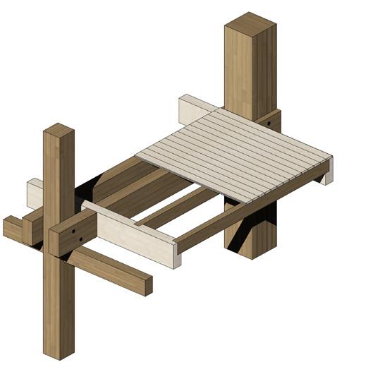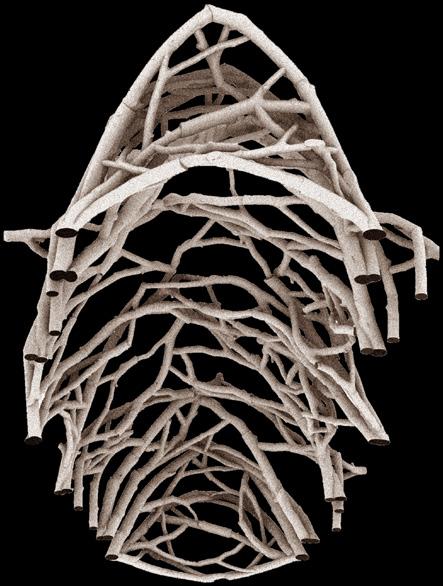Prototype 4 exploits the structural capacity of the fork junction. The final structure is an interplay of many curvatures, consisting of forked pieces weaving together. The Prototype stage results in the final development of a structure built from 140 distinct raw wood components connecting directly to each other by way of milled connections. The final structure is made up of seven arched frame units that land at fourteen points.