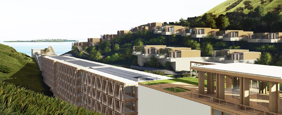 The hotel building runs parallel and gently cradles within a natural valley. This five-storey building houses 86 guest rooms overlooking scenic surroundings and also accommodates a lobby, restaurant, multi-purpose pavilion at the top level, with a gym, spa, and kids club at its lowest floor. The project strives to reduce the building’s environmental footprint using wood, the most critical renewable structural material. In order to support five stories of mass timber, the structure will comprise a concrete podium with two concrete cores. With timber superstructure carrying vertical loads, the reinforced concrete will provide the building with lateral stability.