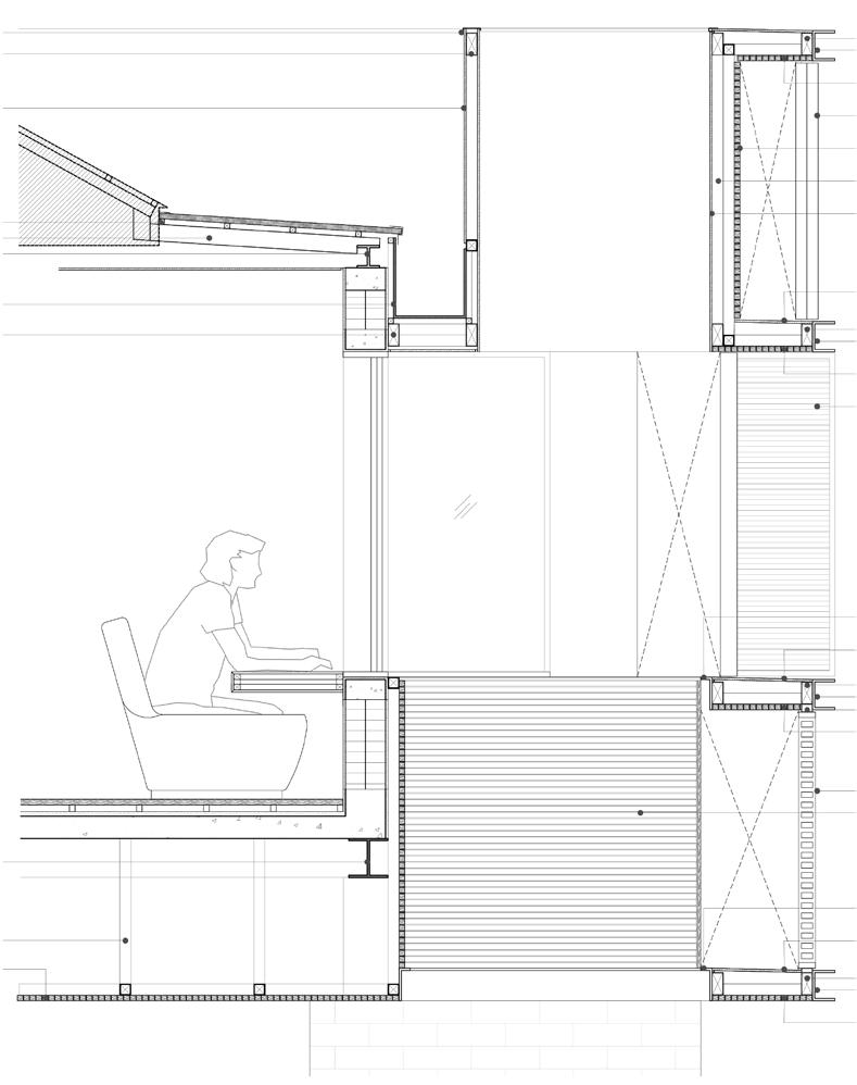 The façades are articulated differently to respond to the bookcase arrangement and the layout of the study area. Inside the Top-Floor Reading Space