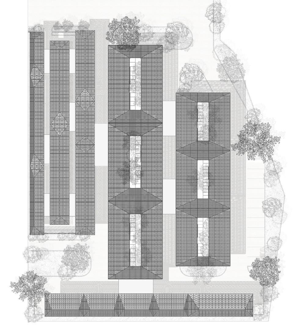 The parking canopy features an inverted trapezoid roof, with all surfaces sloping inward towards the passage.